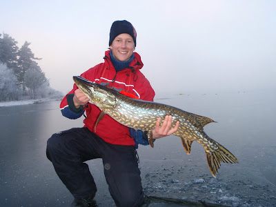 Endelig var isen trygg nok til at vi våget oss utpå. 3-4cm er ikke mye, men det holder to lette gutter. Ved 12-tiden skrek nappvarsleren for første gang. En sik plassert i en skrent på 3 meters dyp ble for fristende.