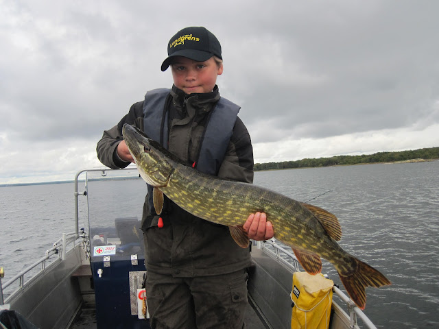 Eftersom vädret var riktigt fint valde vi att ge oss ut i skärgården för att fiska gädda. Vi besökte bara nya platser för att försöka lista ut var de finare metersgäddorna står nu när vattentemperaturen har sjunkit till 12 grader. Willy och jag fiskar alltid grunt med jerkbait eftersom ythuggen är så fantastiska att få. Willy nötte på med en Wolfcreek red carp och hade fångat ett tiotal gäddor mellan 65-75 cm innan denna lite finare gädda högg. Hon var inte så lång endast 85cm men hon var väldigt välmående och vägde 4,3 kilo.