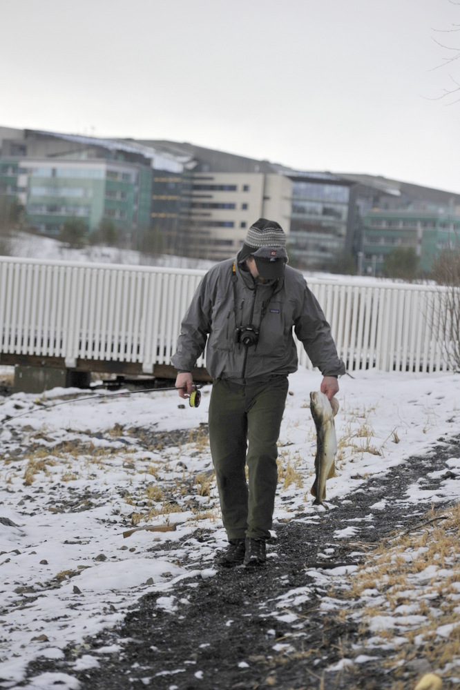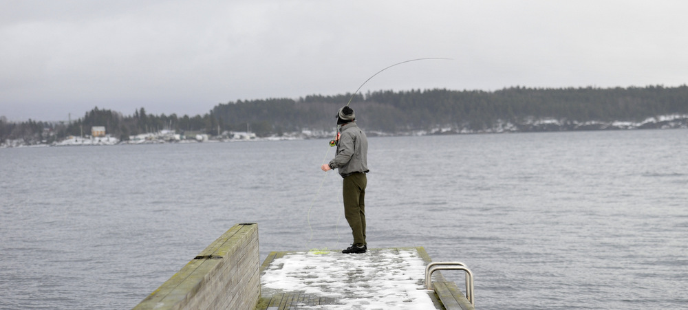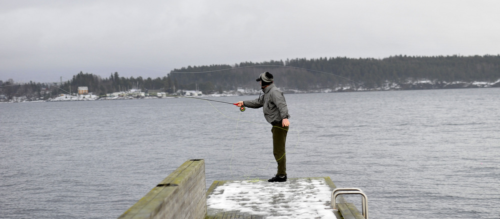 Meget trivelig kar, og god til å fiske. Tore hadde med fluestanga mens jeg hadde med meg haspel utstyr. Det blåste sønnavind og det var nedadgående flo, så forholdene var så bra som de kan være i slutten av februar.