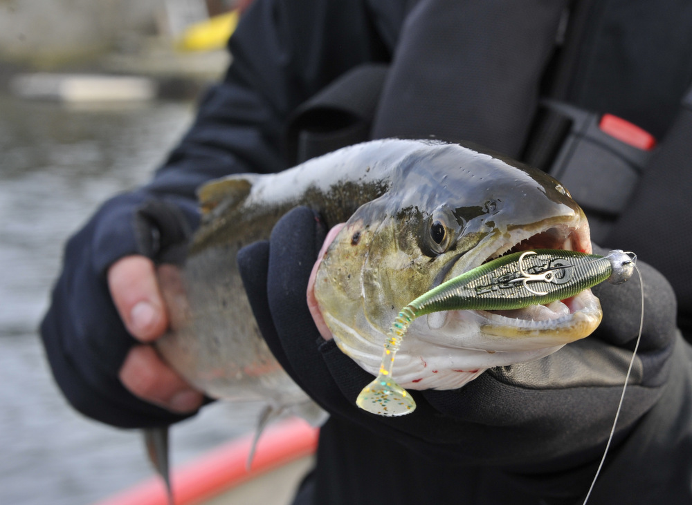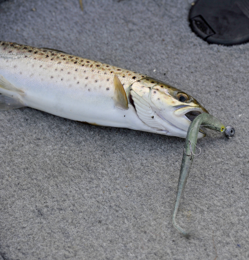 Lunker City shaker 11cm leverte 4 godkjente fisker på denne turen. Denne har en utrolig flott gange. Vi fisket den med 5 grams skaller.