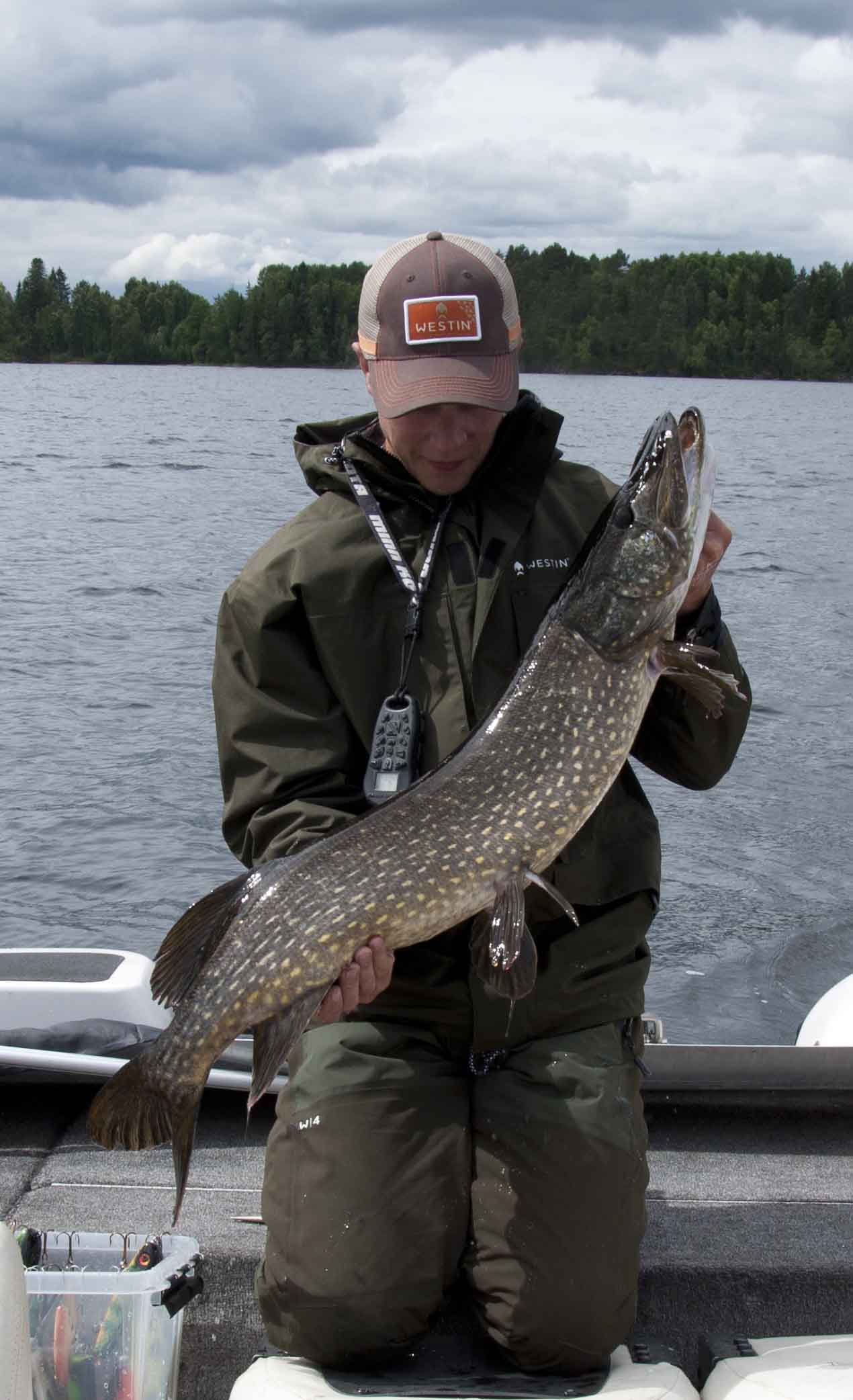 Det som visar sig bli dagens största gädda tar på en platypus fiskad 2m bakom en ytterparavan. Den andra tar en Savage gear Butch rakt bakom båten fiskad på ca 6-7m djup…