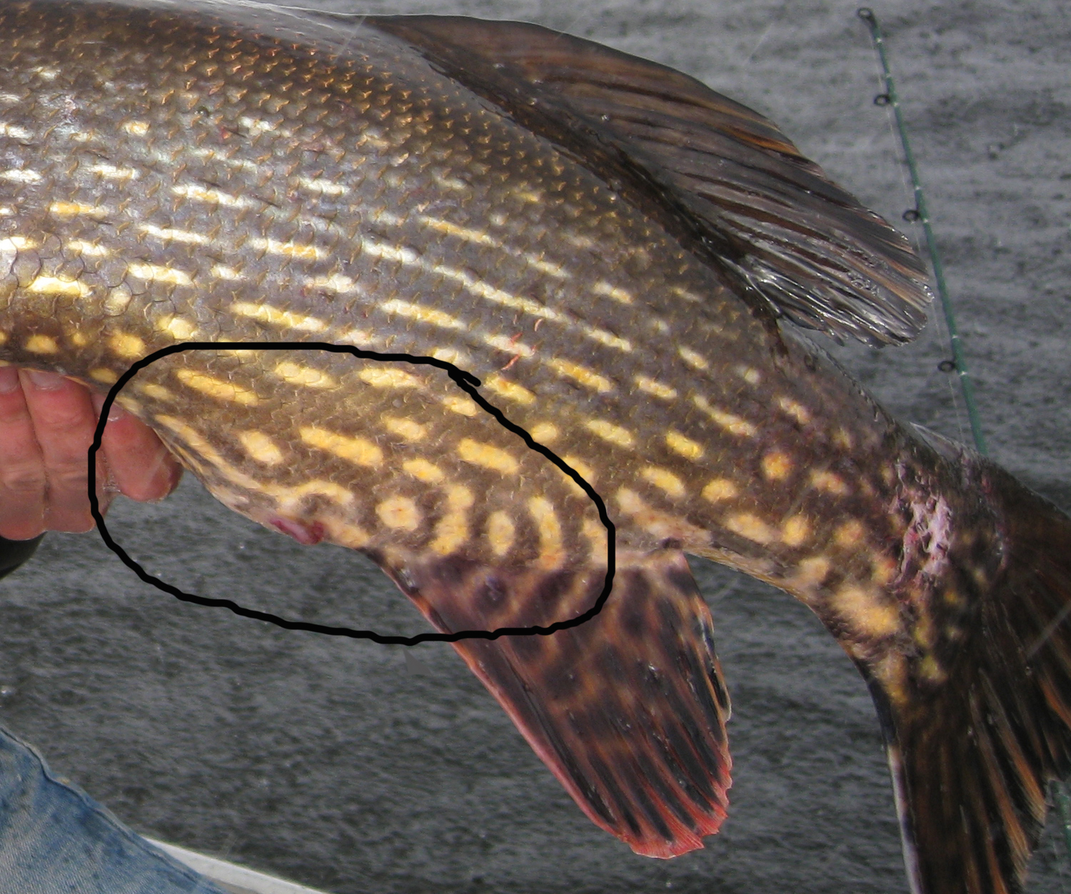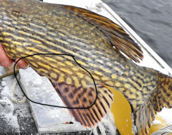 1:a gången (2009) fångade jag själv denna när den börjat äta upp sig efter lek. Vid det tillfället vägde den 13,7kg 122cm och hade då synen kvar på båda ögonen. (Tog på konstbete).