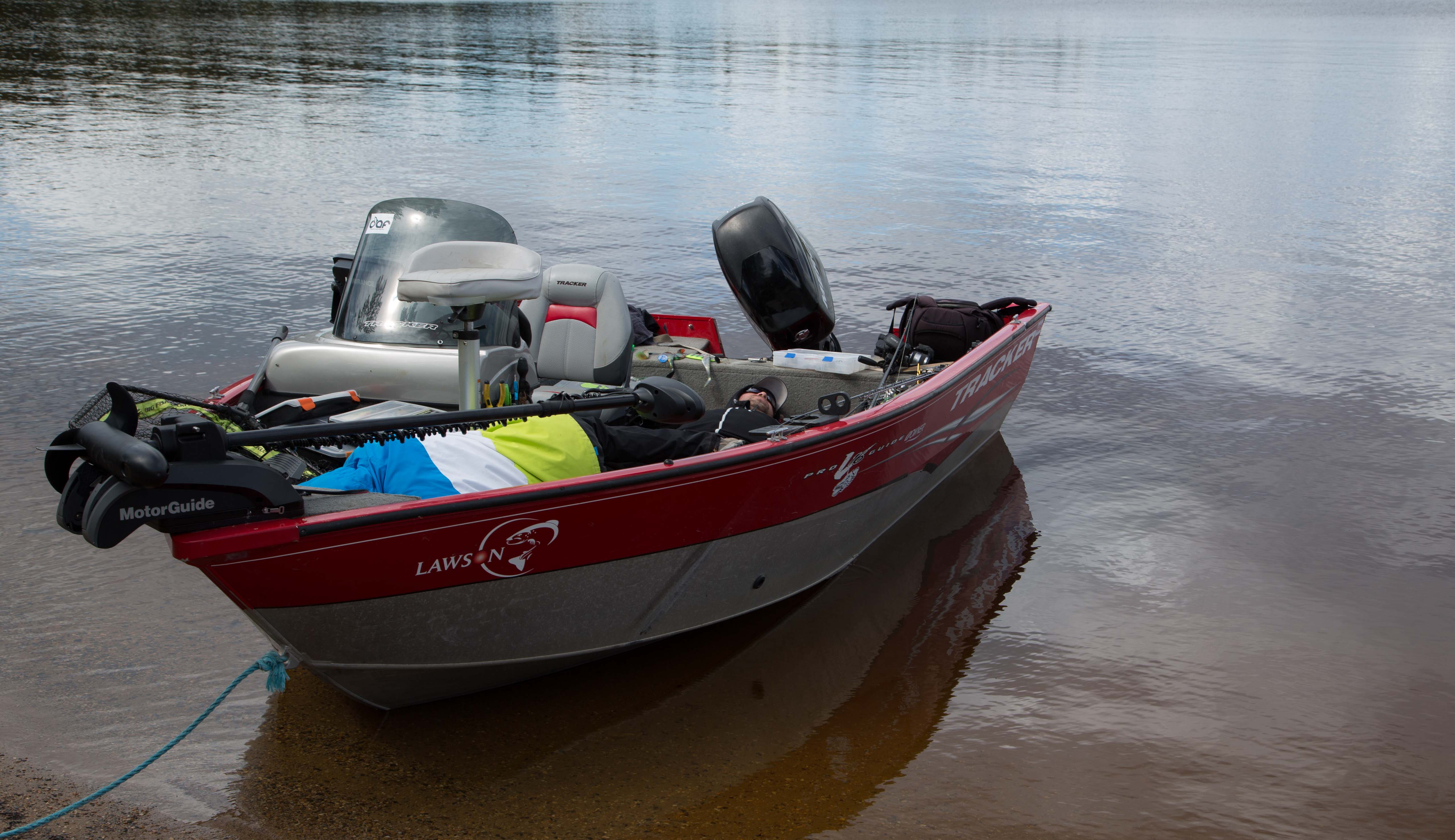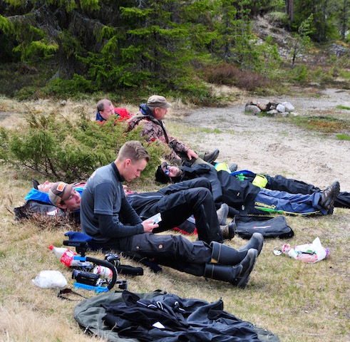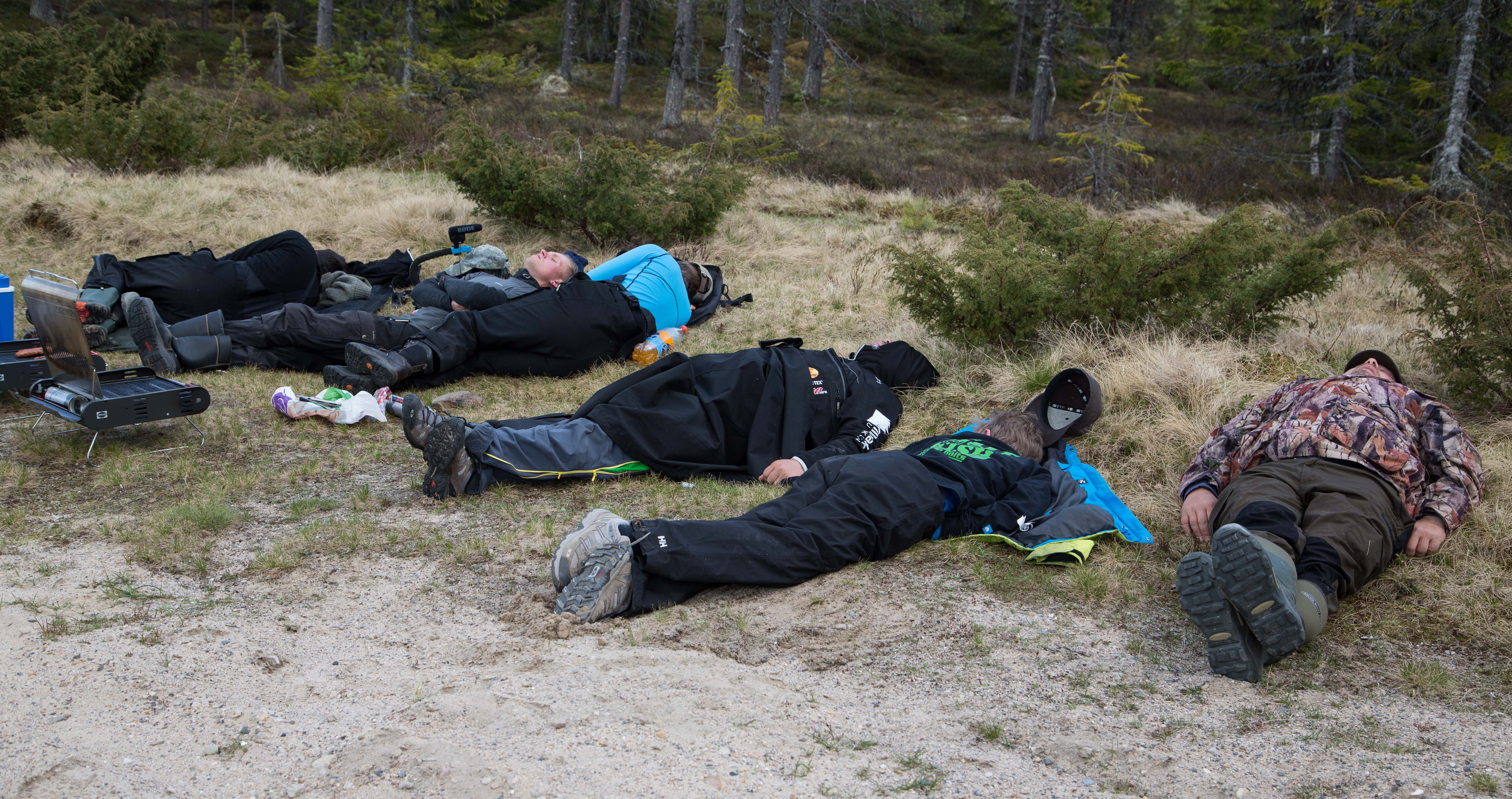 Erik og Daniel som har vært lengst oppe denne dagen ligger rett ut oppi båten og purker og sover når vi andre ankommer lunsj plassen..