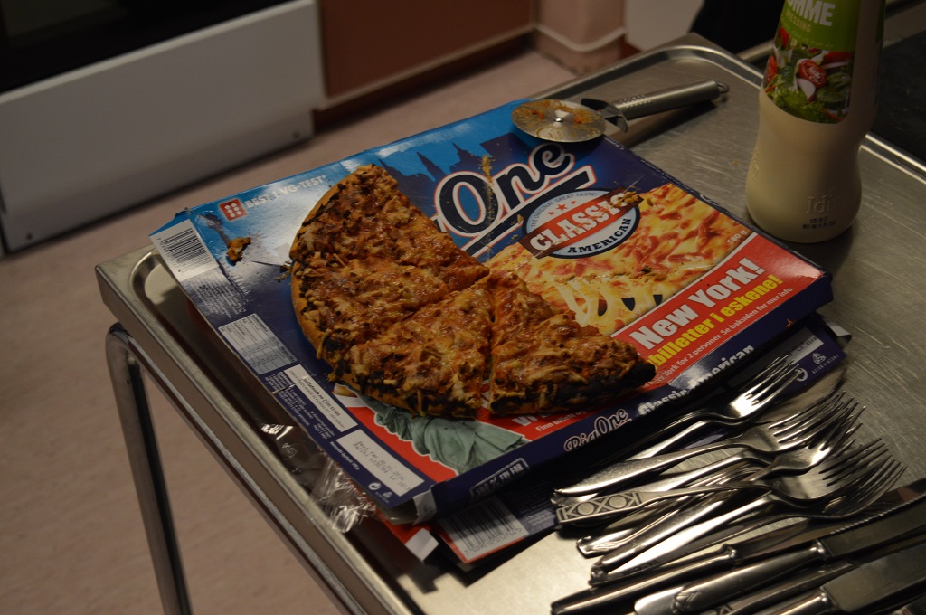 Vel tilbake på hytta skulle det spises. Og det var ikke korv som sto på menyen, det var nemlig frossen pizza! Etter litt problemer fra min side når det gjaldt og få pizzaen varm så ble det da mat på oss etterhvert.. (halvveis utpå natta)