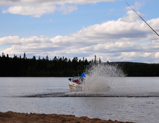 I nordenden av sjøen ligger det en flott sandstrand, med grei nok dybde inntil land så fiskefarkoster av ymse sort lett kan skli stilrent inn og man kan gå tørrskodd inn på land.. Iallfall nesten!