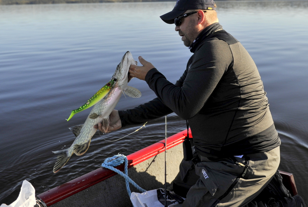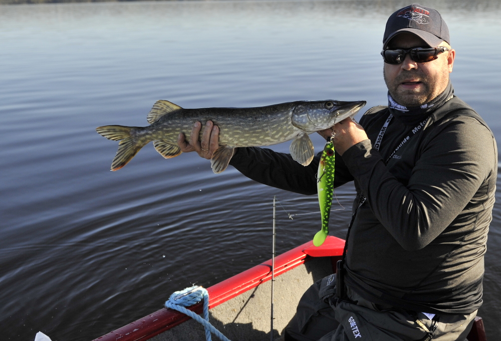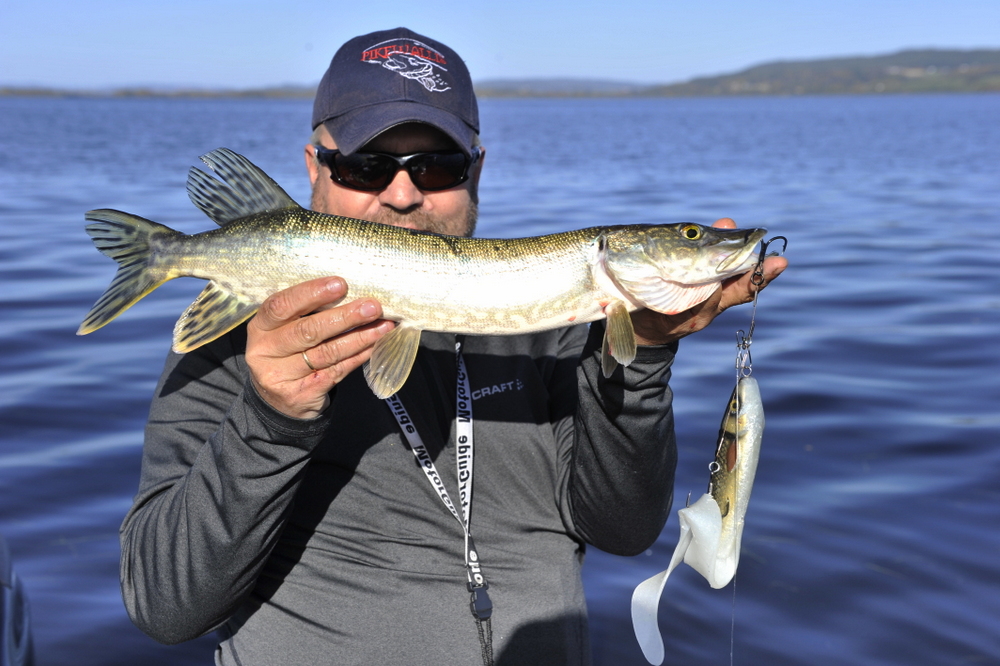 Hva skal man si om Øyeren, den har ikke endret seg så mye og valget for falt på nordre del, selv om vi også tok et par timer lengre sør i vannet. Og fiske i nordre del er alltid veldig spennende og det tok ikke lange tiden før vi fikk smake litt av gamle dager. Olsen mistet en fin fin fisk rett ved båten som vi anslår til rundt 7-8 kg. Jeg hadde et brutalt hugg på en pwshadd 27 cm. så ting var som før. Vannkvaliteten er veldig bra men rundt 1 meters sikt og med litt småbrunt vann, ikke svart. Vi hadde en del kontakter i løpet av dagen og noen fisker kom opp. Michael var glød het på Svartzonker sitt sortiment. Mcpike og MCRubber. Blåhvit og rødsvart ga mange hugg. Og så var det denne vertikalfiskingen med bondybait som faktisk ga hugg på nedhugget. Han fikk et par gjedder på dette fiske og det var gøy å følge med på skjermen til tider. Mine så kalte stokker begynte plutselig å flytte seg opp og ned i vannlaget. Ingen tvil om at det å lære seg å lese et ekolodd er viktig. En ting ting følte meg helt lost i området rett og slett pga av for lite fisking i område. Det er ingen god følelse når man ikke helt «hvor» man er.