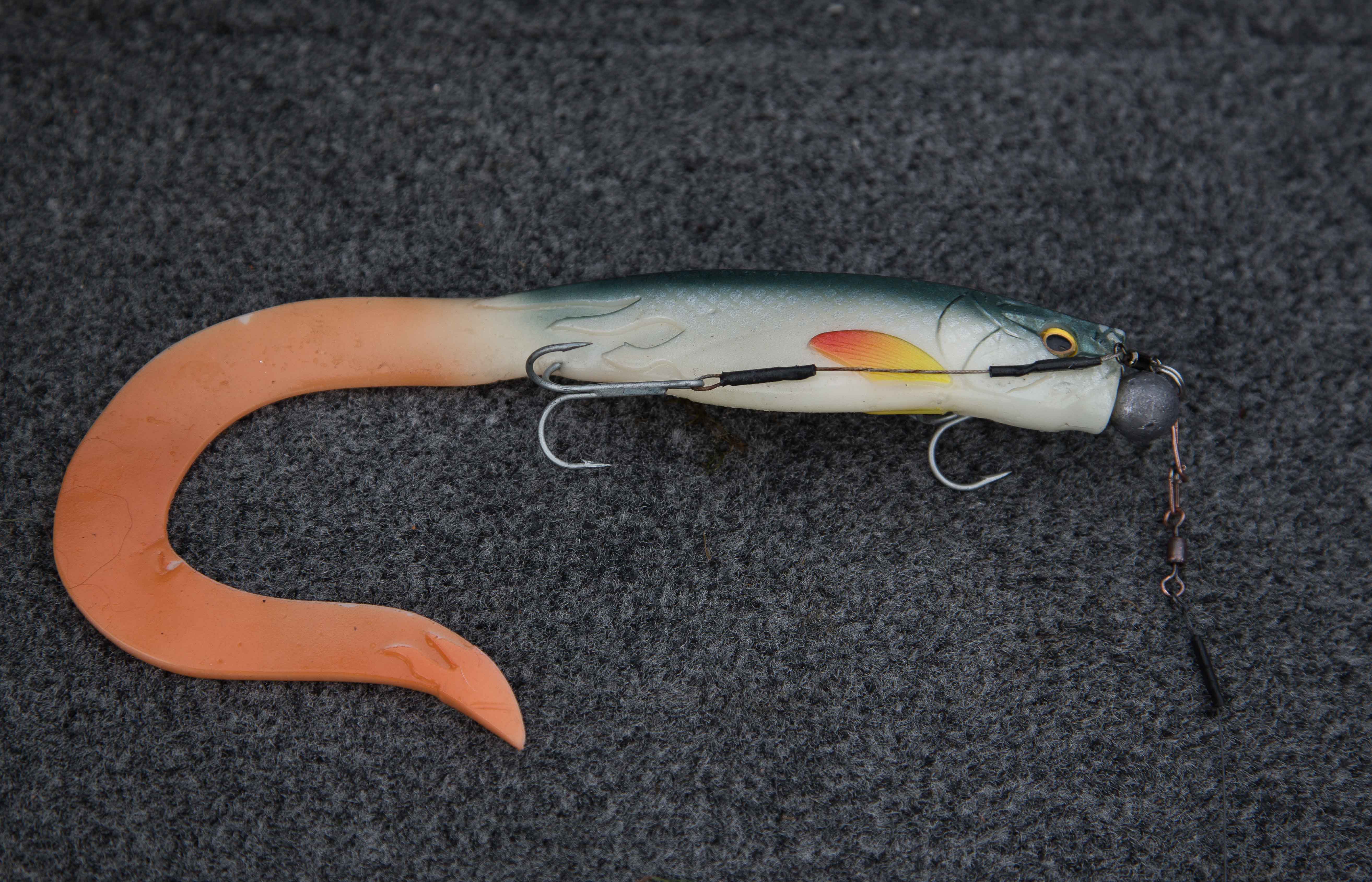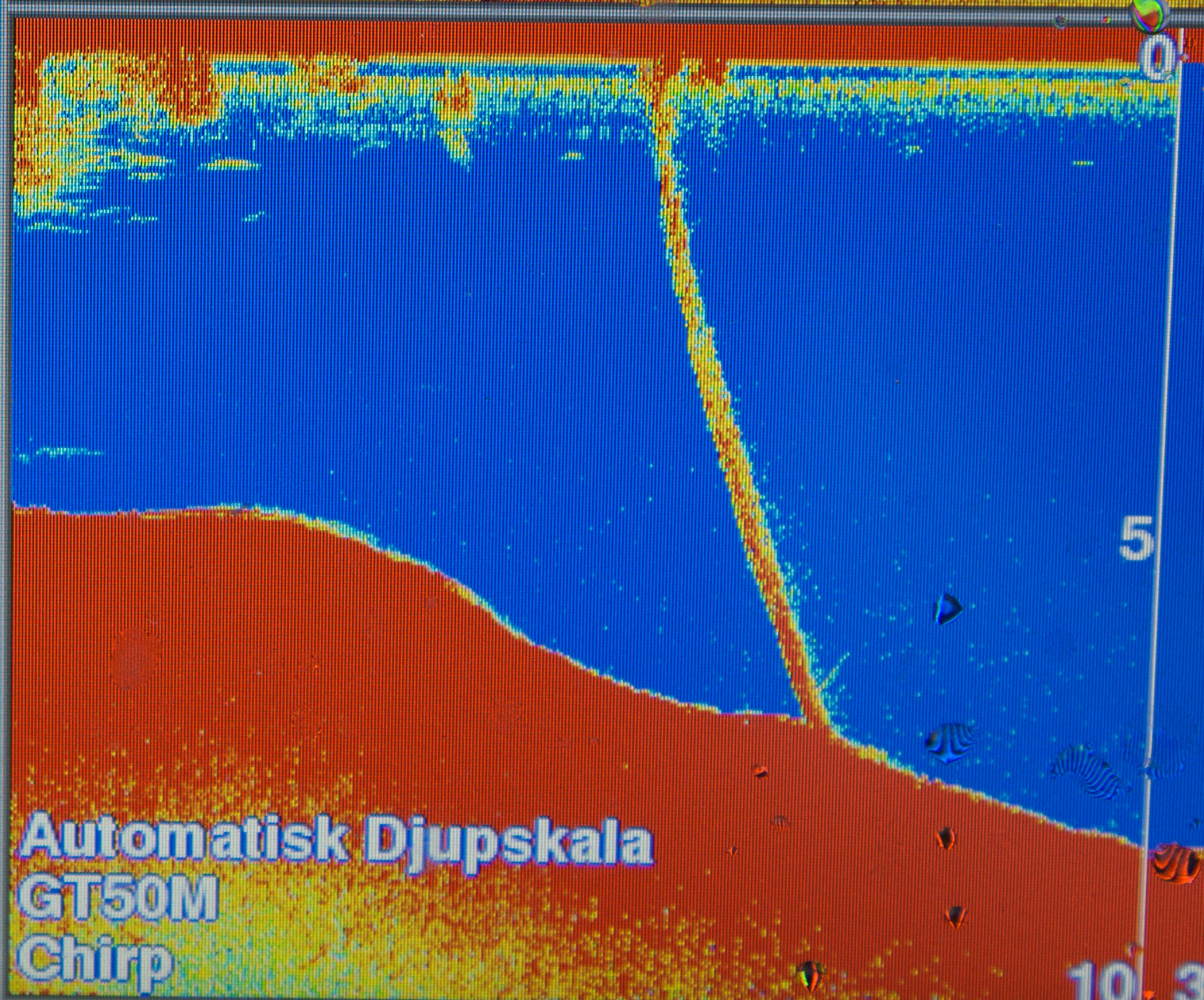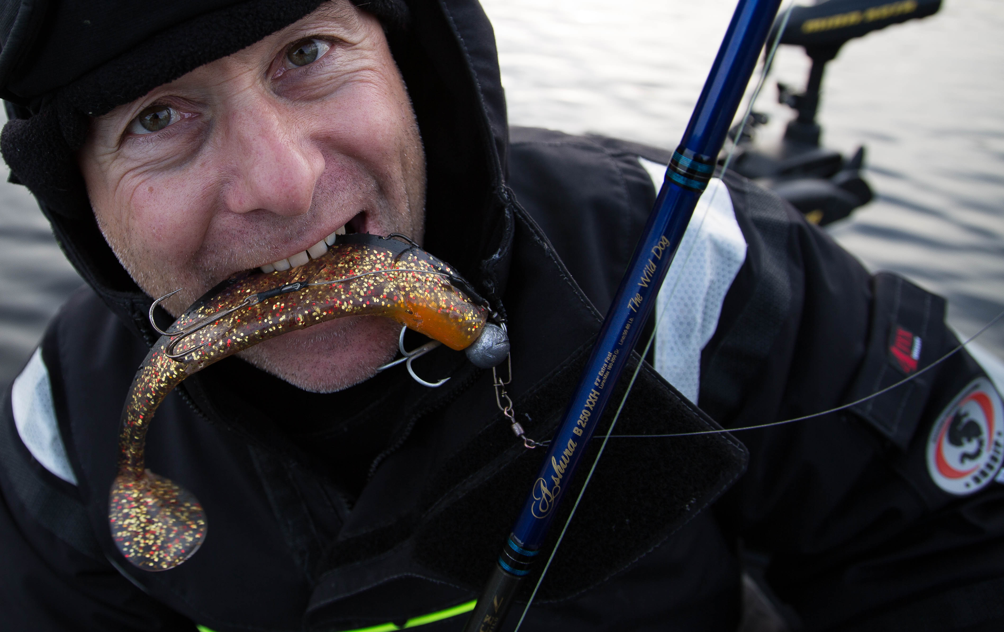 Vi nöter på och gör ett par förflyttningar, men det är helt dött. Två timmar och två tusen kast senare med en Dexter Shad i färgen Gold Carp står jag helt plötsligt med slaklina, jag sätter mothugget och det är totalt stumt!