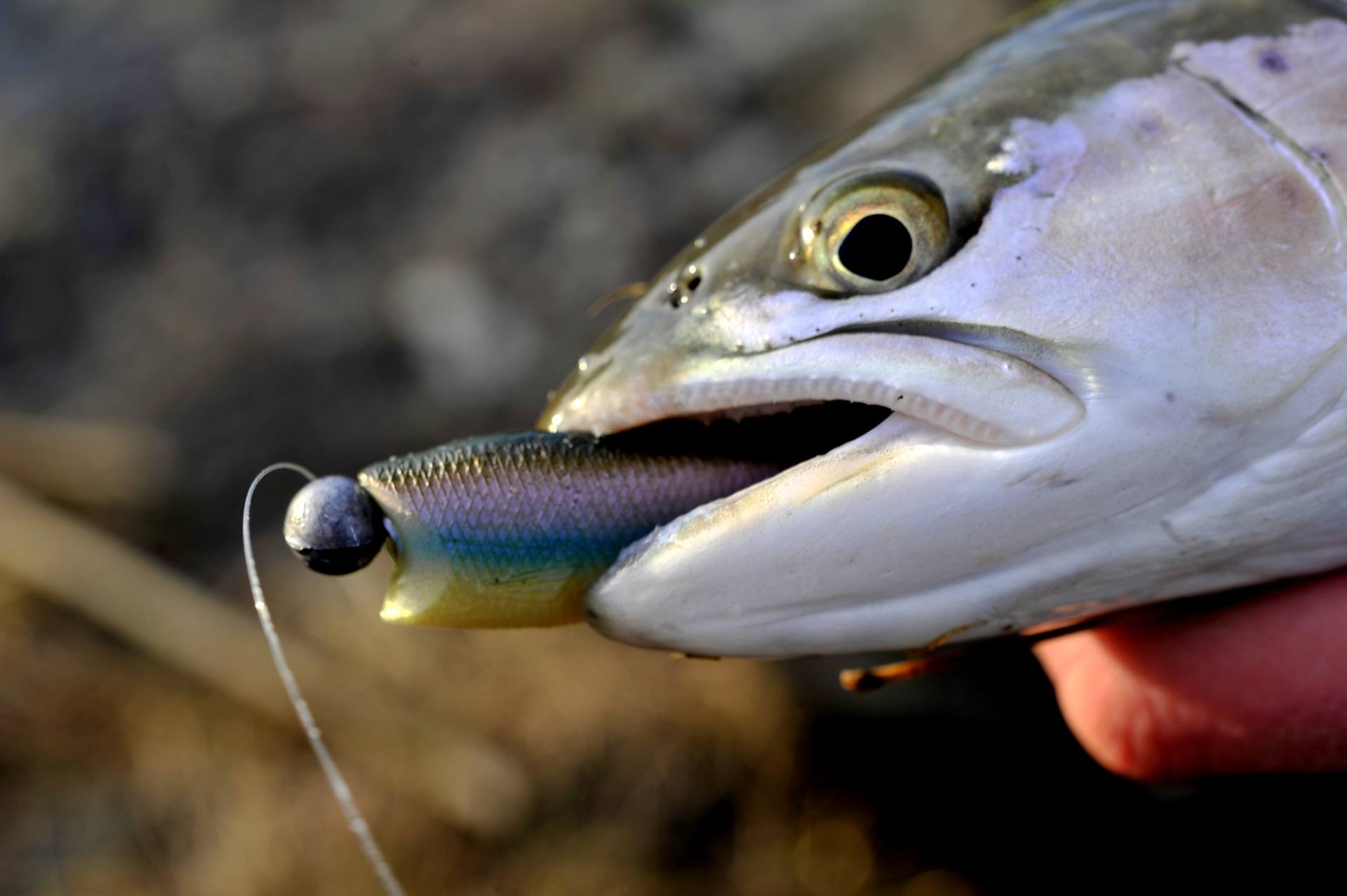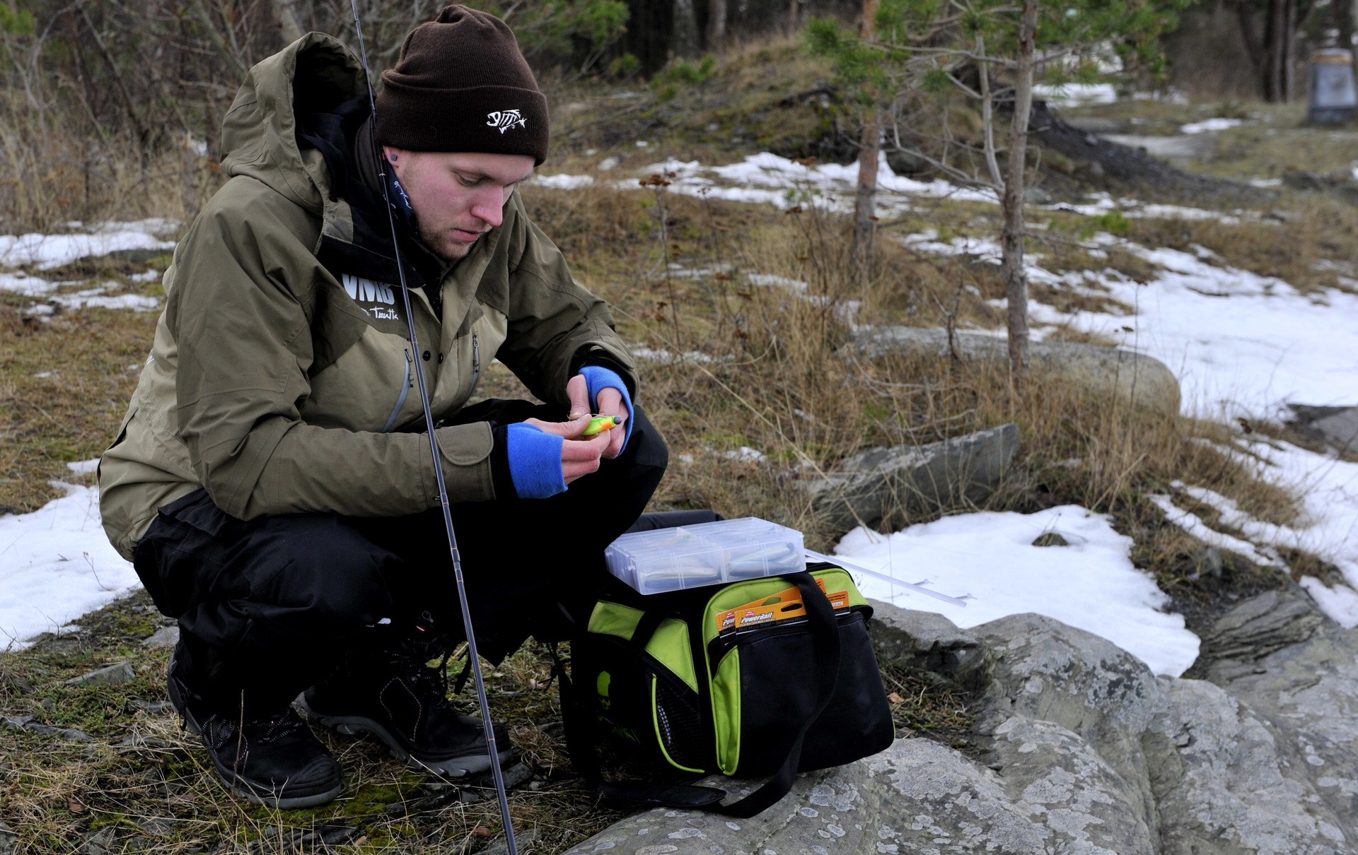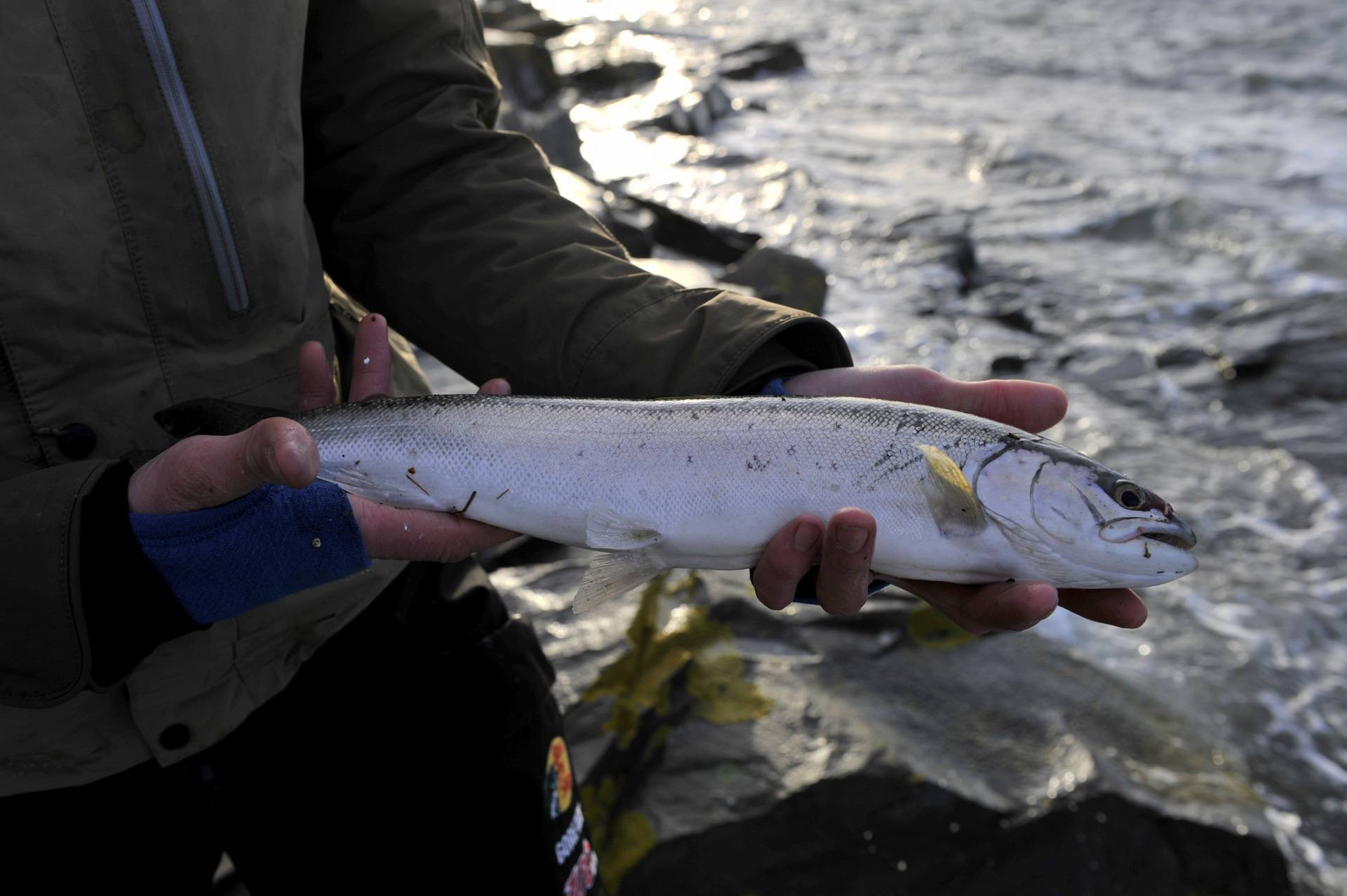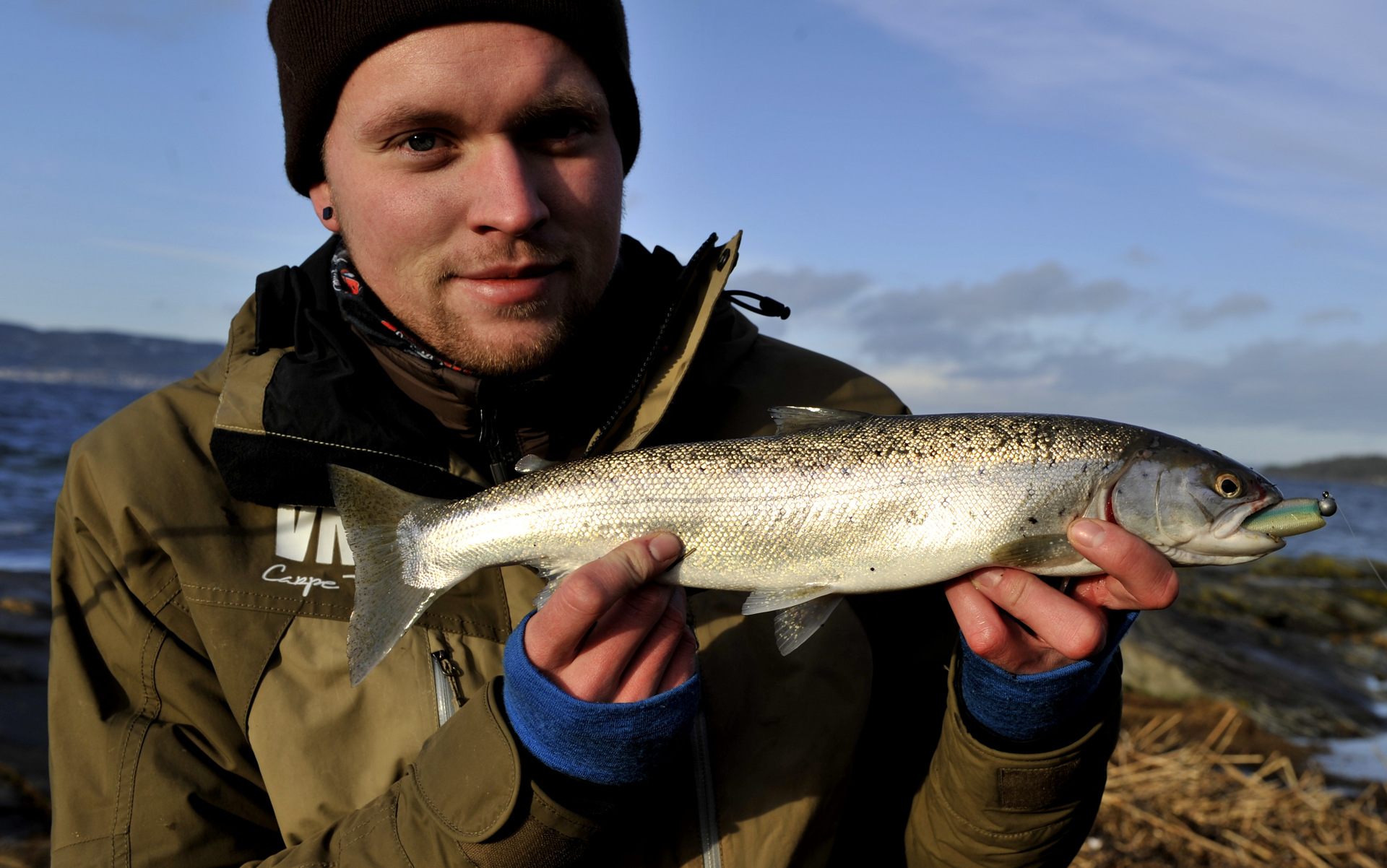 Til slutt så skulle saltvannsforbannelsen brytes for Evensen. Vi sto vel på en av de mest utsatte plassene for vind, men der skulle det vise seg å være en sjøørret som ville ta Nitroshadden til Evensen.  Den 9 cm lang shadden i  fargen Eperlan kom rullende inn mot land og sjøørreten valgt å ta den ca 1 meter før den hadde gått med nasan i berget, og den tok bakfra. Evensen kjørte bare med jiggkroken på denne og ørretene satt fint.  Det ble ikke all verdens av fight men det tror jeg var greit under de gjeldene forhold.