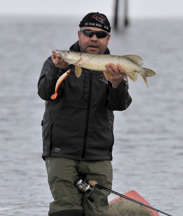 Så hadde jeg gått over til tailen igjen og nå skulle den funke til 100%. Denne fisken er som snytt ut av min abc bok om tanken bak tailen. Man kan fiske denne så utrolig sakte noe jeg mener er glimende under de gjeldene forhold. Små kjappe sveiv for å la den «henge» så et kjapt lite sveiv, for så la den «henge» og i henget skjer det. Da tur står der med litt slakk line, hugget kommer og du føler at gjedda river stanga ut av neva på deg. Større fisk større fisk ropte jeg noe som skulle vise seg å være en liten overdrivelse. Jo da den var større en de andre, men jeg hadde nok ment og trodd at den var større en de 4300gr den veide. Men fy i satan gatan og artig. Nå har jeg og Jeff brukt deler av vinteren for å komme frem til dette designet og allerede på første tur leverer den. Jeg fatter ikke å glad man kan bli, jeg blir helt tårevåt ( ja Roger jeg vet ). Det er noen timer som ligger bak og når det da klaffer så raser bare følelsen igjennom kroppen. Nei da den er ikke stor det ser også jeg men all jobben som ligger bak gjør at denne gjedda kommer til å være en av mine topp 10 fisker. Alt skjedde akkurat på den måten jeg hadde ønsket og drømt om. Mye av gleden ligger jo også i det vi har foran oss, når den leverte i dag kommer den til å levere i fremtiden også.
