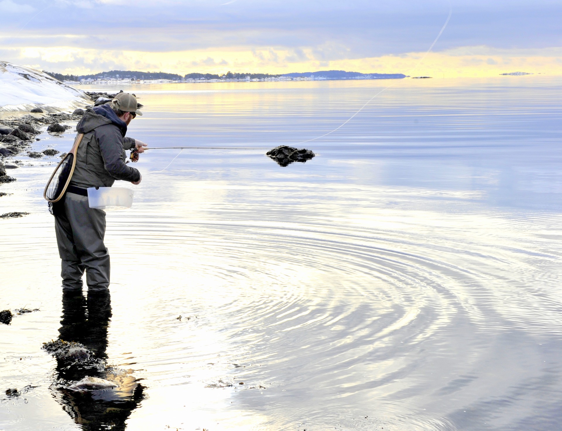 Mathis sto på toppen av et skjær og kastet med sluk og plutselig roper han følgefisk. Jeg sto ikke alt for langt unna med mitt Padora oppsett, med pattegrisen, og plutselig etter 3 blankturer suger en ørret i seg reka. FAST FISK, og den satt på…….. en god stund før det fant det for godt å slippe taket i denne svinesunds flua. F**** . Jeg tror det hele var min feil for jeg ble så utrolig paff da det skjedde, så mothugg ble det ikke snakk om. Fisken satt nok på i 8-10 sekunder og den så veldig fin ut. Håpet om å kroke den igjen var lik null.