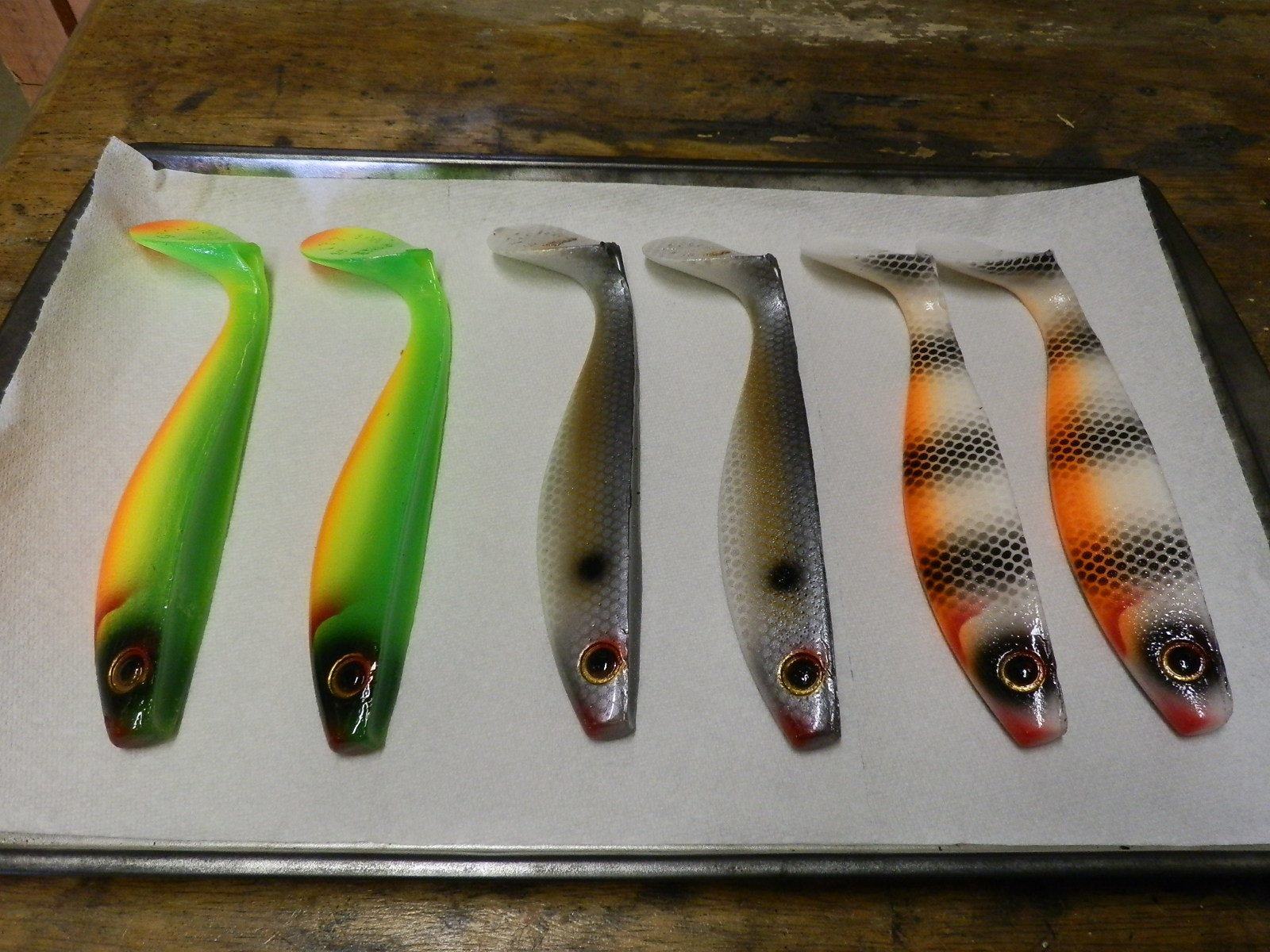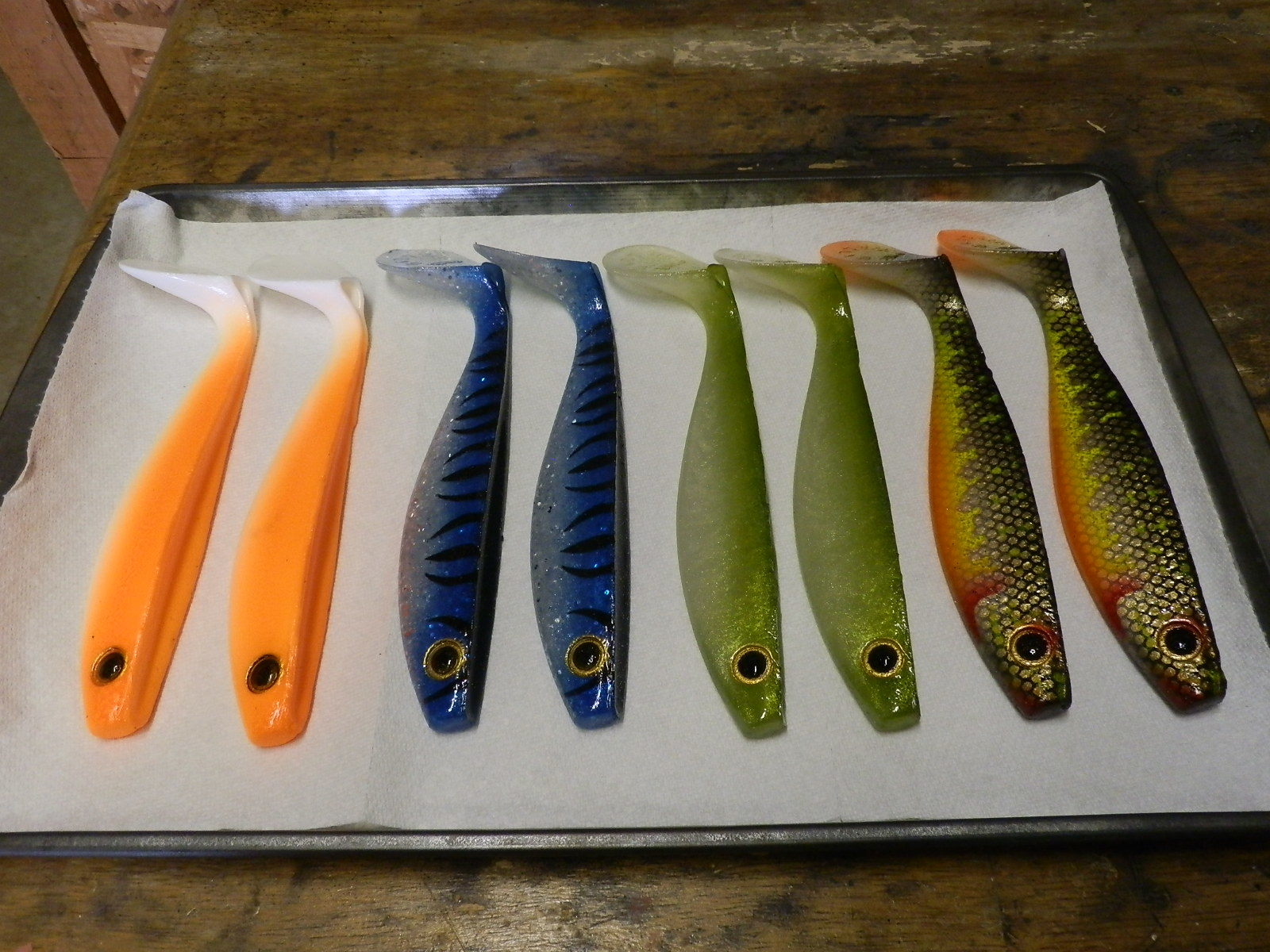 Nå fikk jeg noe bilder fra Jeff i går på baits som er på veg over havet. På første bilde så er det sherbert, en makrell, og en green og hot pike. Fredrick i teamet (som begynner å bli skummelt dyktig på baits og fargevalg) har hatt grymt fiske på makrell. Så da tenkte jeg at den må vi prøve. Resultatet ble en med sølv glitter i buk. Men er det den rette ? Jeg lå å lurte litt på dette i går kveld og kom frem til at jeg vil teste ut å få den også i melke hvit. Blått og svart var helt ok men bytte ut glitter buken med hvit.