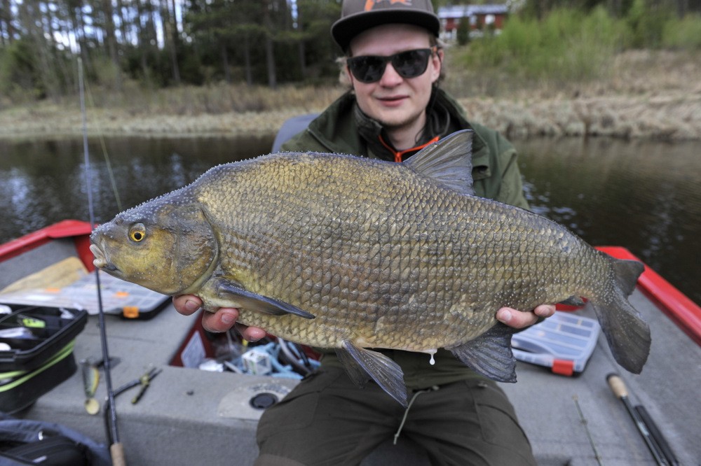 Denna Griner kæren trodde nok at han hadde fått på sjølve gjeddemor, det gikk og det gikk og itte ville det vise seg. Matte, hov, fotoapparat og målebånd ble straks funnet frem i sammen med alt av verktøy. Det var rød storfisk beredskap i båten. Og vips så fikk viste det seg at han hadde kroket en brasme i ryggen. På pene 3,3 kg. Nei da fisken er ikke tatt på riktig vis, men vi ville uansett veie den for å lære oss litt om vekt rundt brasme. Lurer på hvor store de kan bli i dette område egentlig. Bjørnar fikk også kroka en rett etter på, denne var noe mindre og ble kroket av ved ripa. Kan også nevnes at Griner kærn nok har en noe uvant erfaring på brasme. (se gatten)