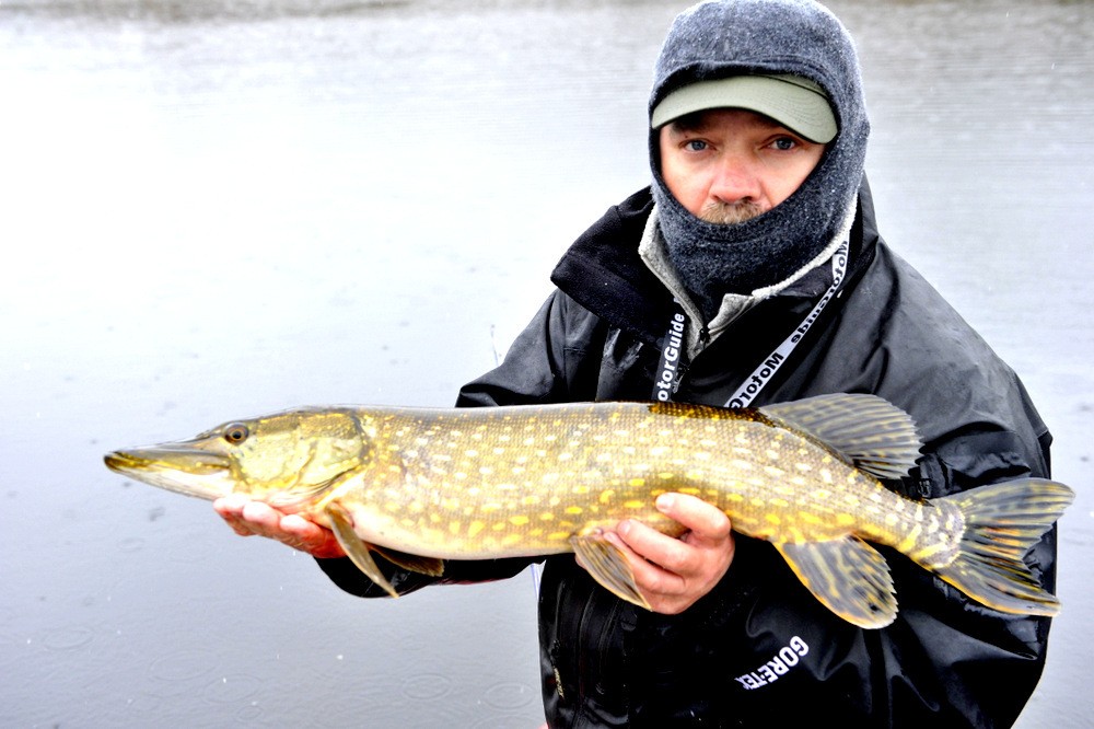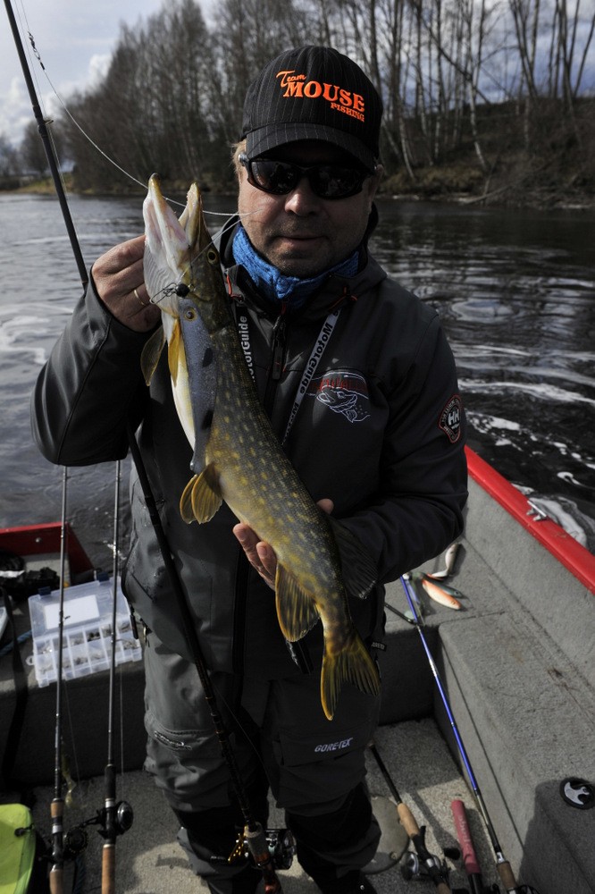 Nytt terreng for Fredrick men første fisken fikk han. Fredrick har på egenhånd siklet på dette stedet i mange år og nå endelig skulle han få testet deler av område ut. Dessverre var vannstanden på veg opp og det er sjeldent noe godt tegn. Blir litt som oss mennesker igjen blir det «flom» må vi kanskje flytte på oss, kanskje pakke litt ned osv osv, samme tror jeg skjer med gjedda, den får liksom litt andre ting å tenke på. Men høyt stabilt vann er noe annet. Vi også lærer oss å leve med høyt vann, men det tar et par-tre dager.