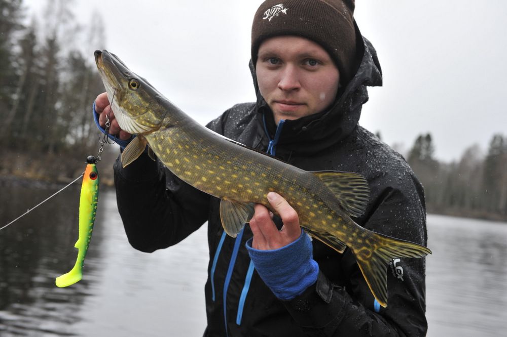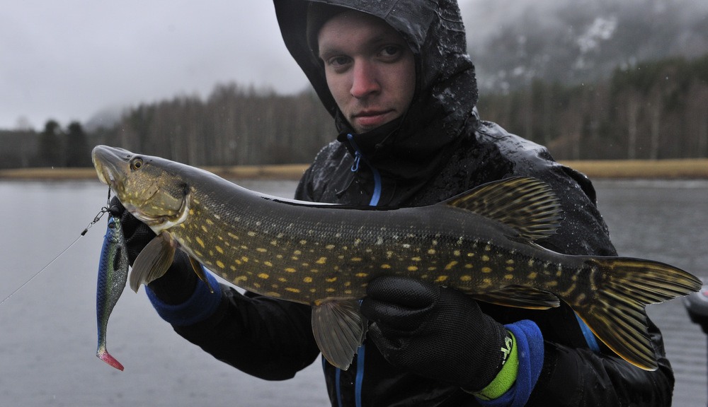 Nå var det så surt og kaldt at ting gikk trøkt i båten og ofte tenker jeg at fisken har det som meg. Så etter å ha fisket en del med shadd valgte jeg å gå over til tail, fiske den ekstremt saakktte og vips var det ei lite gjedde som gapte høyt nok til å bli med en tur i båten.