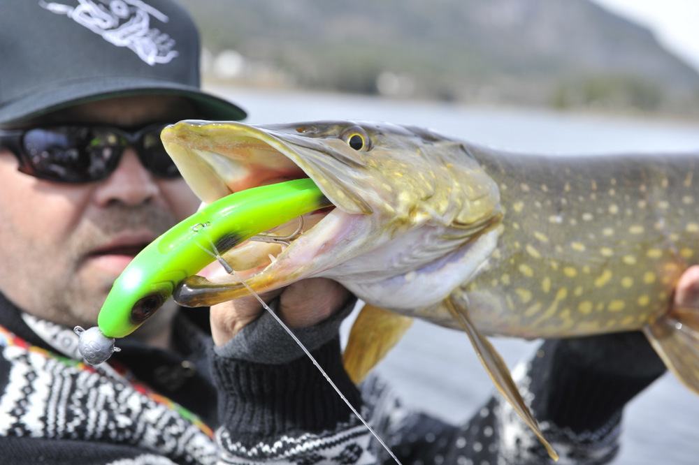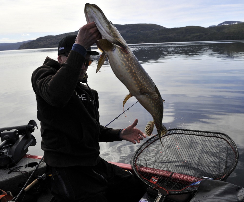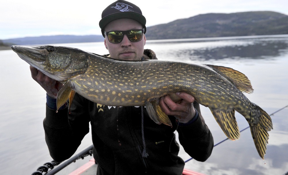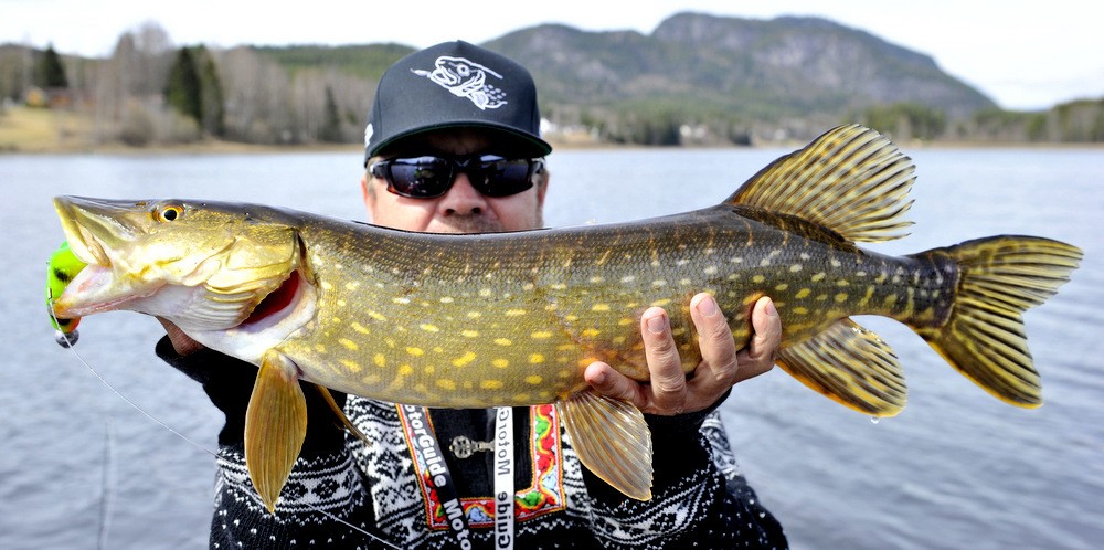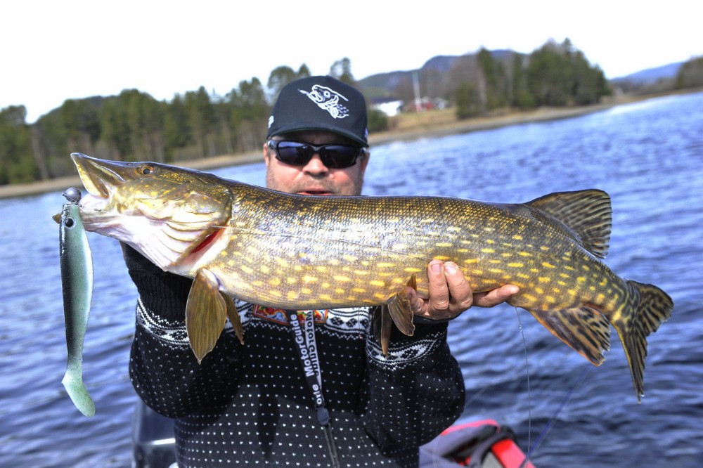 På torsdag som var, skulle jeg og Walmann ut å nøta opp noen gjedder tenkte vi. Det var ikke lett å velge hvor vi skulle legge tiden, det stod i mellom 3 forskjellige vann. Etter litt omtanke så valgte vi et vann vi var rimelige sikre på at vi skulle få fisk i. Etter å ha fått satt ut båten, så kjørte vi bare noen få meter ut og starta å fiske. Det tok vel 3 kast, så fikk jeg et hugg og fisken satt på i 4 sekunder så slapp den… Fa********* den kjentes bedre ut… Menmen, jeg og vårfiske funker ikke.. Men så, bare noen kast senere så smeller det til noe så jævlig i nedsleppet. Fisken bare går og går og vil ikke opp. Når jeg ser den nede på 7-8 meter dyp så får jeg litt panikk og roper ut hov hov hov hovvvvvvvvvvv. Den så ut som 10++++ der nede på dypet. Men etter at hovmester Walmann har fått hova gjedda så ser vi jo at den ikke veier 10++++++.. Men i mine øyne så er det ei knall fin gjedde likevel med sine 97 cm og 6,9 kg. Fin kondisjon og falt for en Illex Dexter Shad 200 UV.