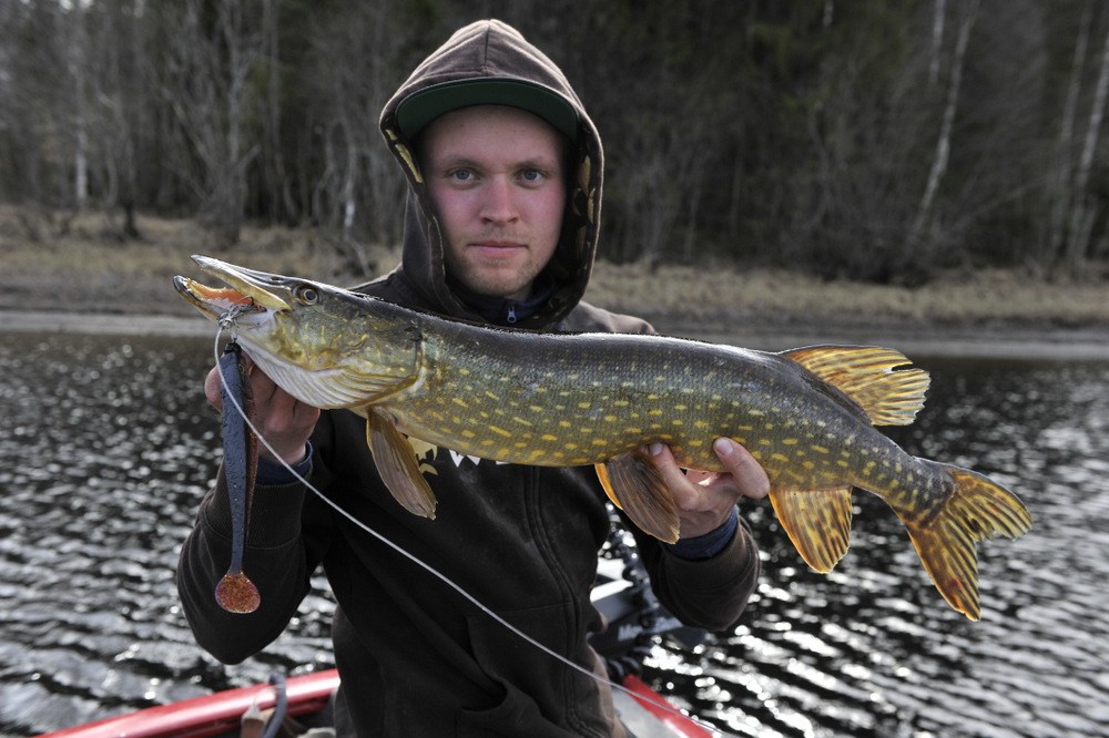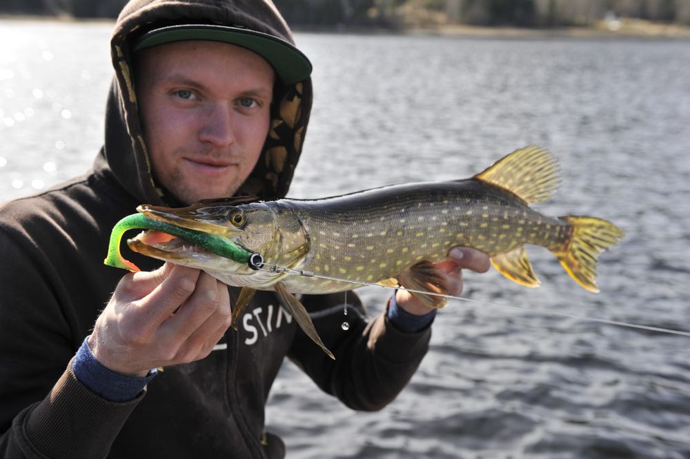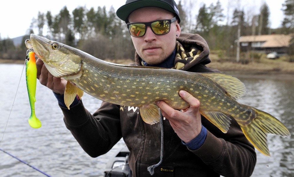 Dexter Shad UV har levert bra for meg og jeg prøver å følge tabellen som sier hvilken farge som skal brukes når. Og det fungerer rimelig bra. Pluss at jeg er super glad for at dem har laget Dexter shad i en 200 mm str, for den føler jeg funker bedre på vår fisket enn f.eks 250 mm. Og jeg trur 200 mm kan bli meget bra på sommerfiske også. Nok om shad info, og over til fiske igjen.. Etter å ha rota rundt en liten stund rundt der jeg fikk min fisk, så kommer vi til et dypere parti hvor Walmann smekker på 30 g bly på sin pw shad og senker ned til bunn. Da tok det vel omtrent 1 minutt så BAM og bloggpappa driller sin første fisk for dagen. Ei gjedde med fin kondisjon.