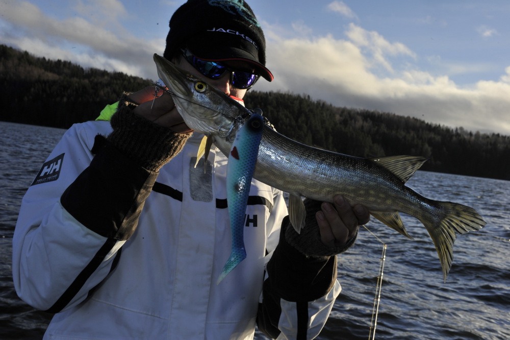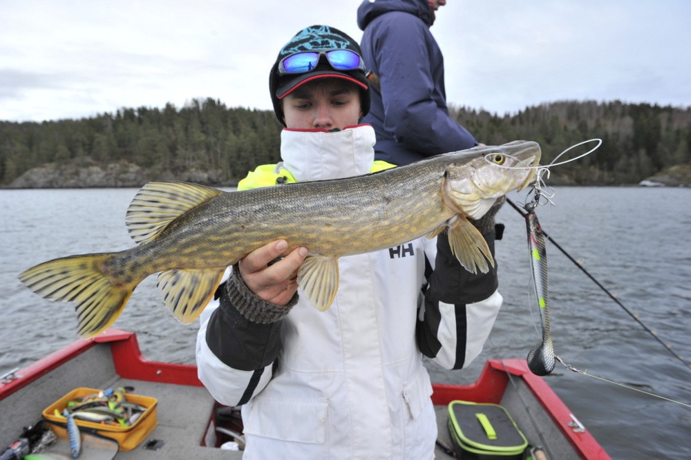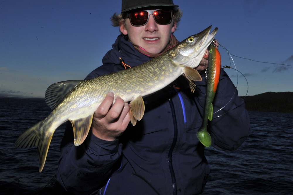 Så var det Erik sin tur. Denne tok en PW-shad gen 2, i fargen fegis? Vi fant egentlig gjedda fort i dag, og det tok ikke veldig lang tid før det var noen gjedder i båten?