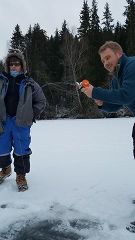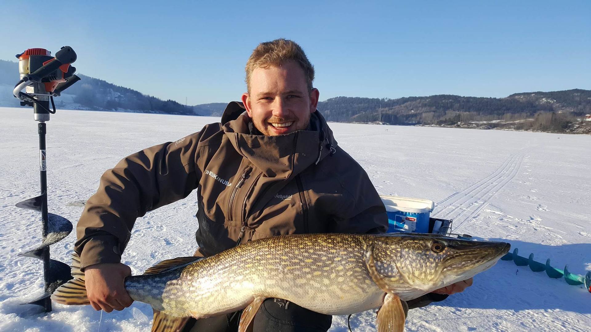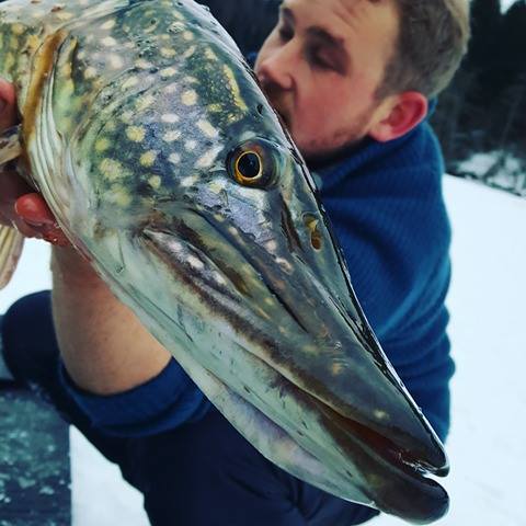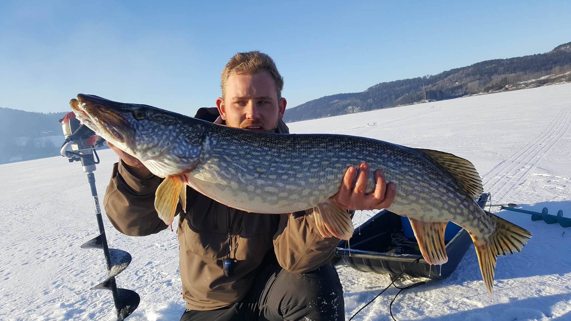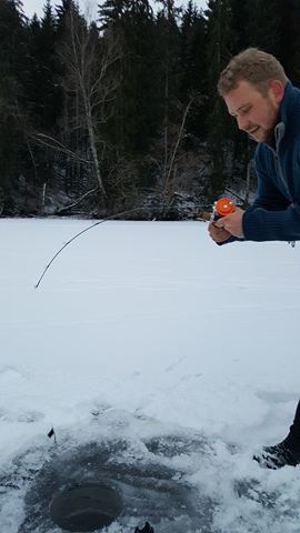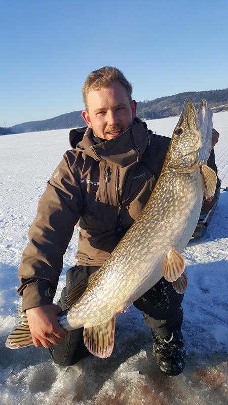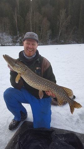 Lørdags kvelden la jeg nye planer for søndagen. Her skulle vi teste en plass som kan være seig i februar. Tempen på mårran var og litt for kald men sola kom og ga oss flott varme. Hærlig vær uten en sky. Bror og dama løp rundt og pilka etter abbor. Fisk fikk di men fant aldri de store eksemplarene, men morro var det nok vi hadde vell sitti ett par timer før første run. Dette var en liten fisk som gikk ut igjen uten målinger og vekt. Men deretter stod stanga til Vidar halveis ned i hølet. Her var det virkelig ei madam som sa ifra. Han sleit voldsomt med denne. Opp 2m ut 5 om og om igjen. Opp på isen og rett ut i vann bassenget med ho. Her tok Vidar en svendsen og skar opp fingeren skikkelig på ei hjørne tann. Dette blør og stopper aldri en flott fisk på 107cm med en vekt på 8.790kg. Personlig rekord på isen for Vidar så detta var en glad mann gratulerer gubben dette er en plass som bette er helt motsatt. Kl 10-11 er giftig. (Den store fisken tok 10.05.) Ellers er det bra fra kl 3 og inn mot mørket. Men dette stemte ikke denne gang. Vi hadde 4 fisk iløpet av dagen. Jeg hadde tippa 5 run men med en bra toppfisk så er dagen reddet Vidar er jaggu seig å holder ut. Gnu på han har lært nå at timer er det som gjelder. Vi nærmer og mars fort og nå blir ting bare bedre og bedre. Di virkelig store begynner og luske rundt. Så håper vi melder inn årets første over 10kg ut og fisk i go været fremover. Dra tidlig ut,en hærlig følelse når sola kommer over åsen og varmer i ansiktet ut å bruk den flotte naturen vi har takk til alle sammen som var med. Noen dager jobb så er det ut igjen. Heihå vi prates