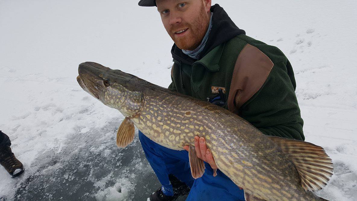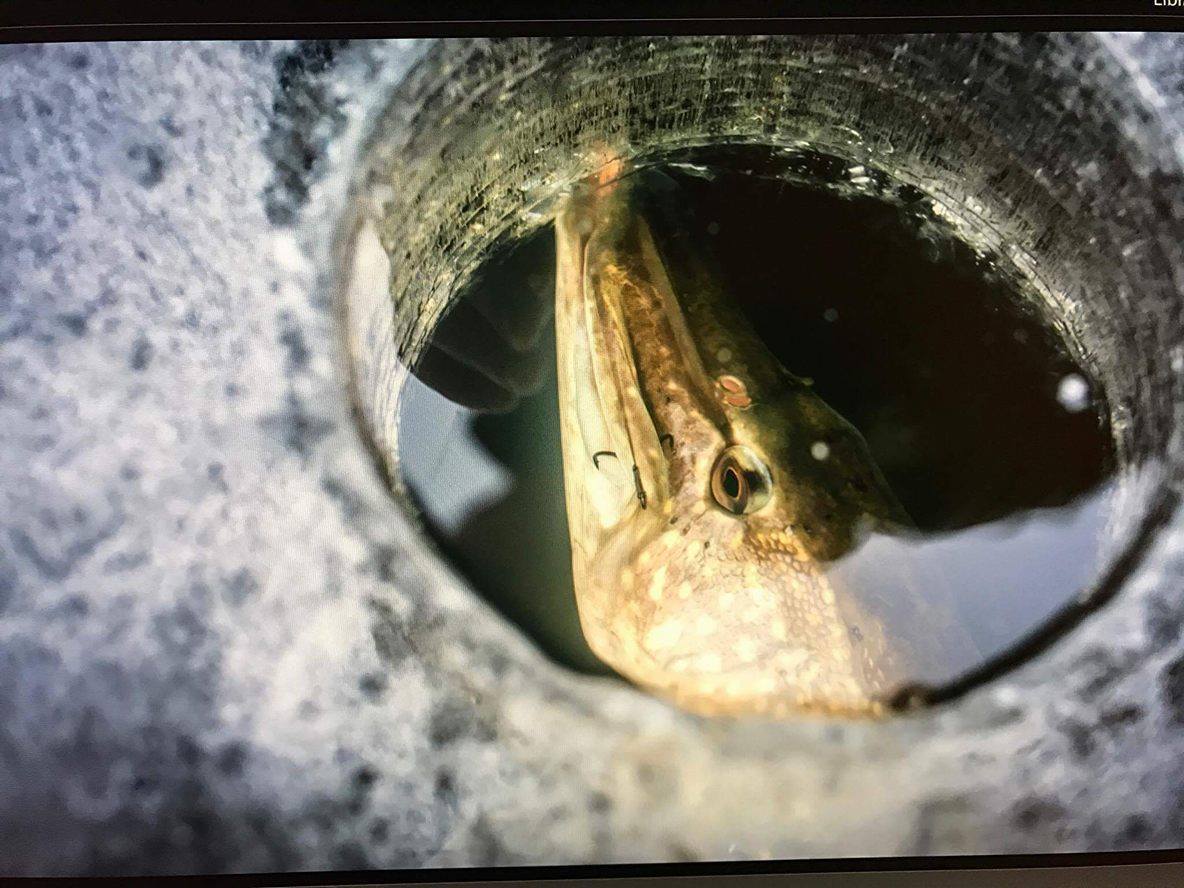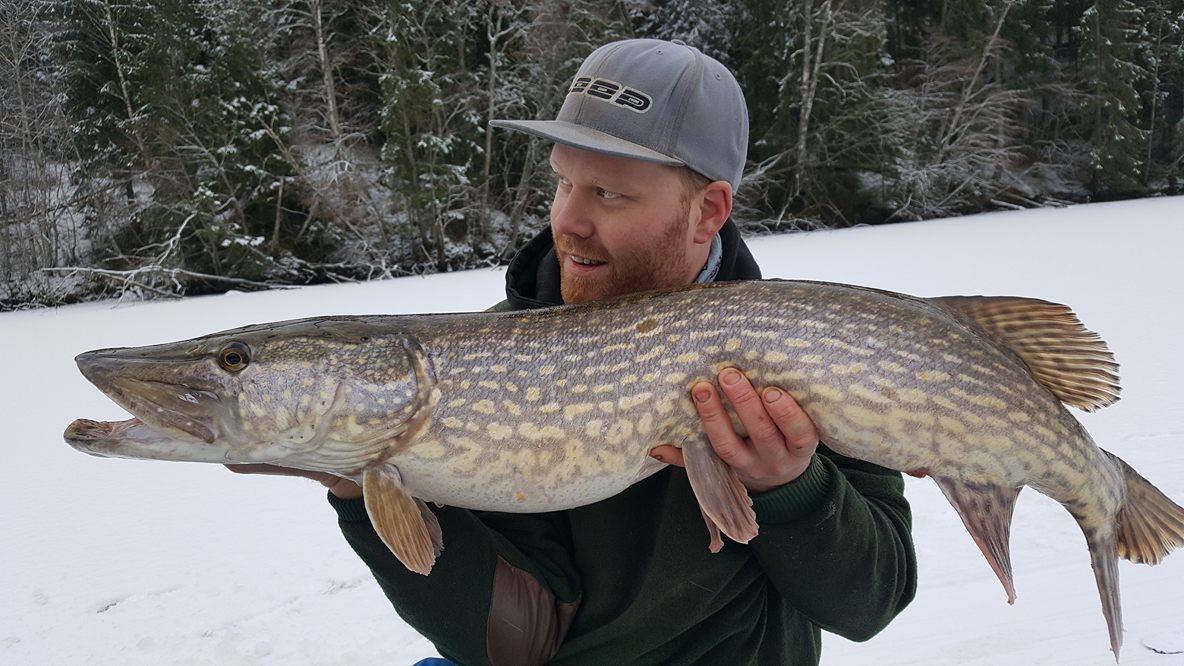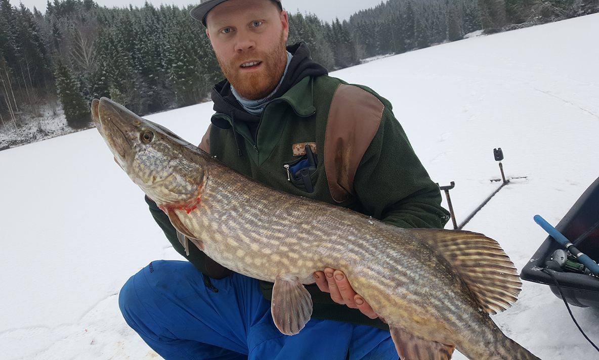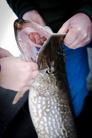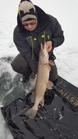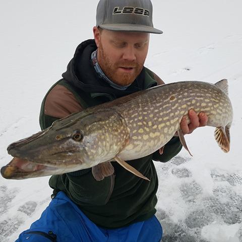 vi er inne i februar, da måtte jeg ut etter gjedda denne helgen. Lørdagen startet voldsomt bra med at jeg forsov meg på mårran. Brodern ringte og sa hvor f er du hen a. Brå våknet og heiv ting i bilen. Løp ned på isen og rett over kl 9 var stengene satt. Denne plassen leverer helt klart best fra lysninga til kl 12. Slik var det også denne gang. Det river til på første stanga jeg satt. Ei tung flott gjedde i andre enden dro forbi hølet..ga fra seg en god fight og opp på ligge underlaget fikk vi ho. Målte ho til 103cm med ei vekt på 8.56kg.mens vi holdt på med vekt og bilder river det til på stang 2. Opp kom ei gjedde på 98cm og rundt 6kg. Denne veide vi ikke for ble litt kaotisk der. Fort opp ett par bilder og ut svømte di en etter en. Med pulsen i 100 satt vi oss ned med en kaffekopp og stang nr 3 piper rolig og pent avgårde. Nok en tung gjedde sitter og viser seg i hølet. Den tippa jeg til 8-9kg. Lengda strakk seg tell 106cm og 8.93kg. Hærlig. Innen klokka var 11 hadde vi 5 gjedder på isen. Jeg var dum ei stønn og prøvde å avkroke ei gjedde uten tang. Tok navan nedi kjeften etter kroken. Da klemma gjedda igjen og hånda var låst fast skikkelig.her ble det mye blod og hard lærdom. Takk for hjelpa Henrik og Tommy. Tommy og ann-louise. (Bror og dama) gikk litt med balansen å lugga opp noen abbor. Henrik Johansen dukket også opp. Dette er en gutt som vet hva han driver med når det kommer til photo. Fikk knipsa noen fine bilder i løpet av dagen. Her er det ikke spart på utstyret