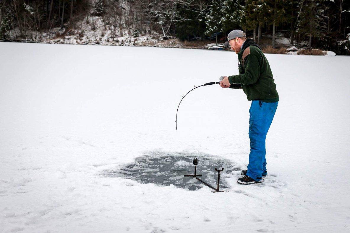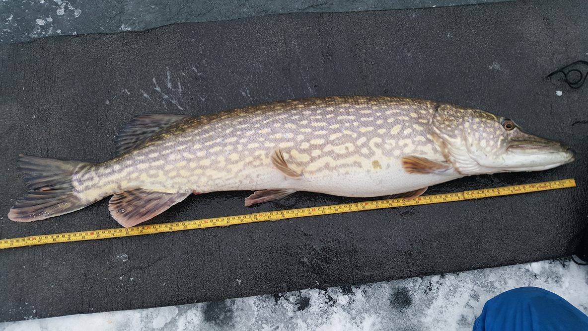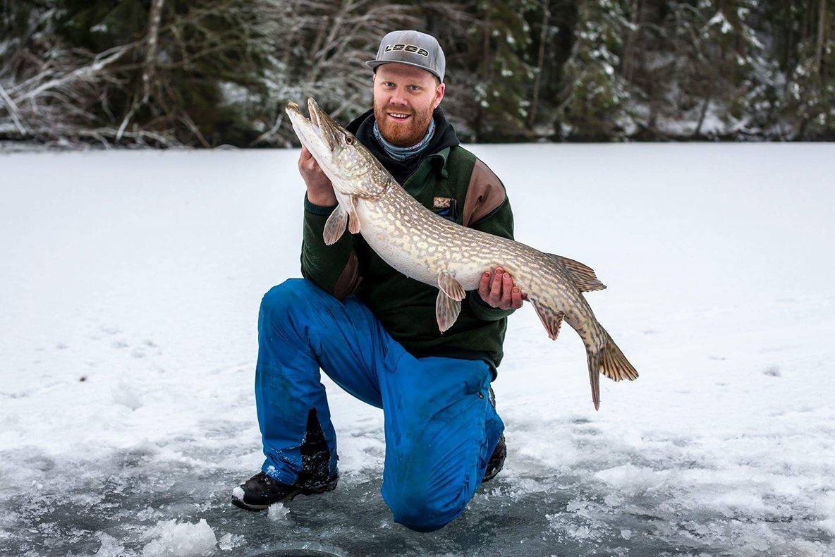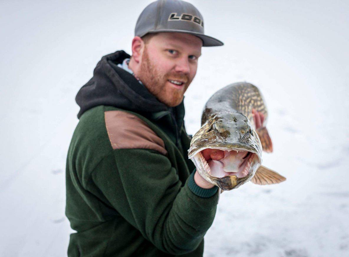 vi er inne i februar, da måtte jeg ut etter gjedda denne helgen. Lørdagen startet voldsomt bra med at jeg forsov meg på mårran. Brodern ringte og sa hvor f er du hen a. Brå våknet og heiv ting i bilen. Løp ned på isen og rett over kl 9 var stengene satt. Denne plassen leverer helt klart best fra lysninga til kl 12. Slik var det også denne gang. Det river til på første stanga jeg satt. Ei tung flott gjedde i andre enden dro forbi hølet..ga fra seg en god fight og opp på ligge underlaget fikk vi ho. Målte ho til 103cm med ei vekt på 8.56kg.mens vi holdt på med vekt og bilder river det til på stang 2. Opp kom ei gjedde på 98cm og rundt 6kg. Denne veide vi ikke for ble litt kaotisk der. Fort opp ett par bilder og ut svømte di en etter en. Med pulsen i 100 satt vi oss ned med en kaffekopp og stang nr 3 piper rolig og pent avgårde. Nok en tung gjedde sitter og viser seg i hølet. Den tippa jeg til 8-9kg. Lengda strakk seg tell 106cm og 8.93kg. Hærlig. Innen klokka var 11 hadde vi 5 gjedder på isen. Jeg var dum ei stønn og prøvde å avkroke ei gjedde uten tang. Tok navan nedi kjeften etter kroken. Da klemma gjedda igjen og hånda var låst fast skikkelig.her ble det mye blod og hard lærdom. Takk for hjelpa Henrik og Tommy. Tommy og ann-louise. (Bror og dama) gikk litt med balansen å lugga opp noen abbor. Henrik Johansen dukket også opp. Dette er en gutt som vet hva han driver med når det kommer til photo. Fikk knipsa noen fine bilder i løpet av dagen. Her er det ikke spart på utstyret