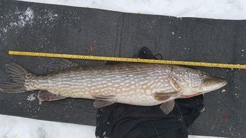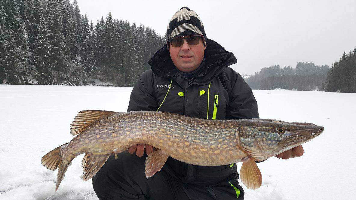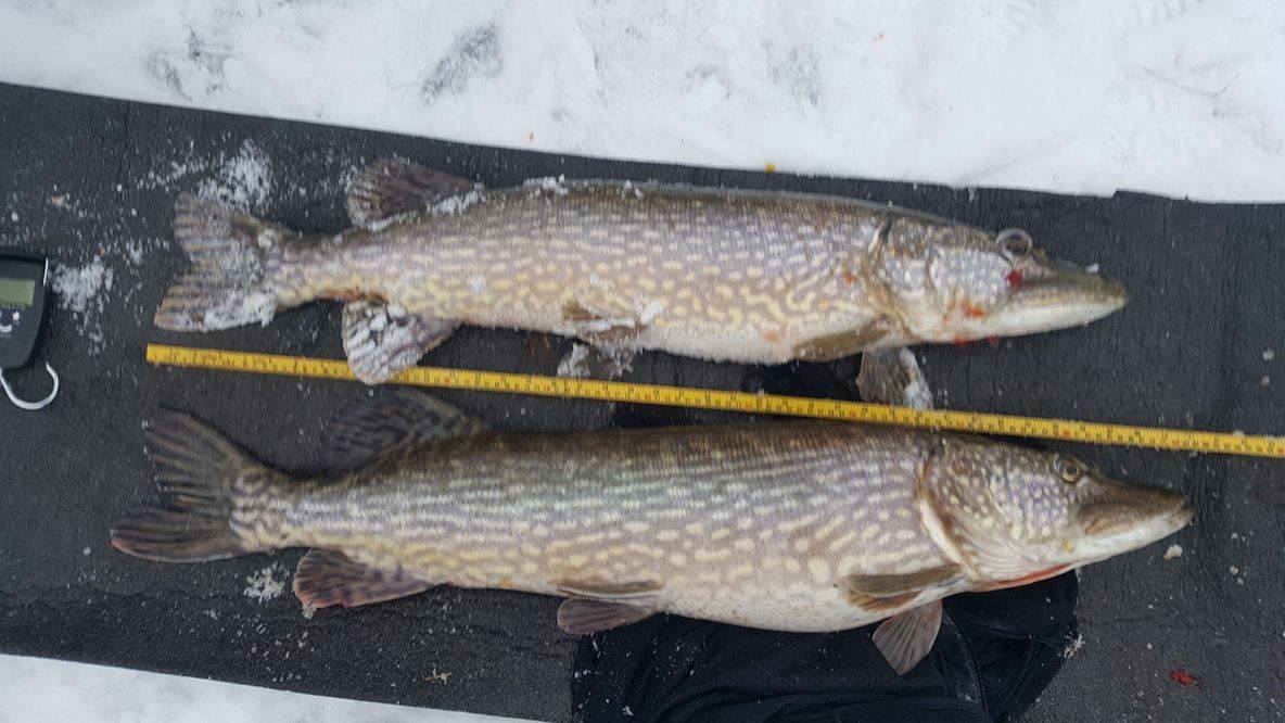 søndag hadde jeg med Petter Støttum. Da var stengene satt i lysninga men dag nr 2 er alltid litt tråere. 2 kjappe smågjedder opp på isen. Ca 09.30 går det på ei tyngre hos petter. Denne fightet godt og målte 99cm med 6.60kg. Første over 5kg for dagenutover dagen viste det seg at idag var det seigt. Det var noen run frem til kl 12. Da hadde vi 5 gjedder. Petter mista nok en grei gjedde på ca 5-6kg. Etter kl 12 hadde vi ett run