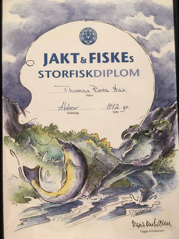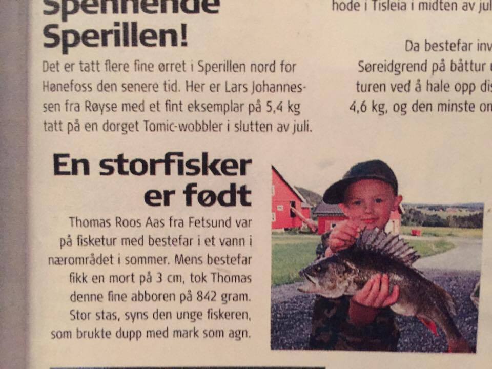 Jeg lot duppen ligge ute, for når det regna, da hadde jeg virkelig trua. Plutselig forsvinner duppen, stanga seiler bortover båtripa, jeg spretter opp og griper tak i utstyret før det blir med ut i vannet. Jeg skjønte fort at dette var en stor fisk, men hvor stort det var, for meg den gangen, hadde jeg ikke peiling på. Det blei en liten fight med denne fisken ettersom fiskeutstyret jeg brukte var ment for å lempe opp tusenbrødere. Vi fikk omsider abboren på land. Både bestefar og jeg var helt i ekstase, at vi ble kliss klass våte av regnet ga vi ikke en tanke. Abboren var på 842 gram og den var 44 centimeter lang! Dette var min «PB» frem til sommeren 2016, da ble den slått med knappe 58 gram i samme vannet. Som 7-åring var dette dritkult! Fra da visste jeg at fiske – det var noe jeg skulle drive med!