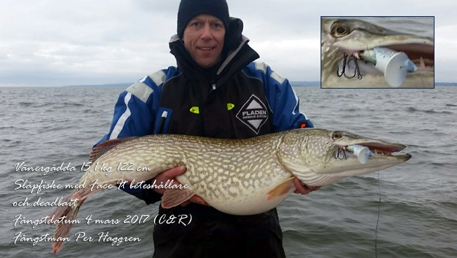 Et helt nyt bekjentskap var denne killen. Per Haggren som just har tatt en real gjedda. Vi hadde et trevlit samtal i Fladen moteren om hans fiske og hans oppfinnelse. Utrolig trevlig kille. Han er mannen bak face it.