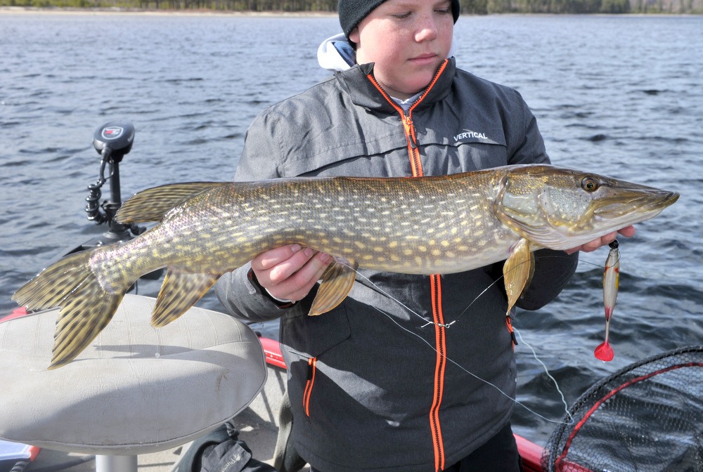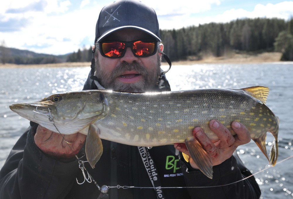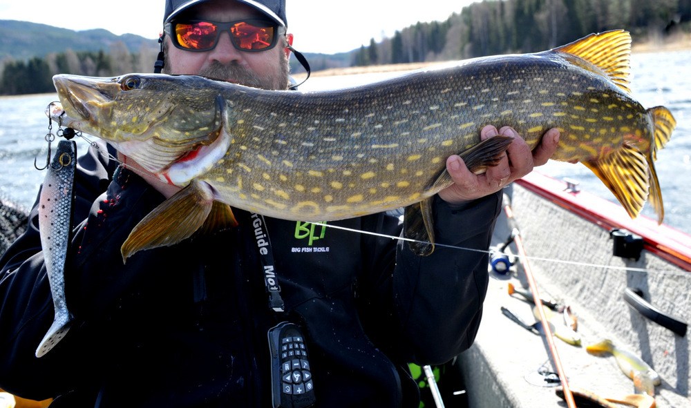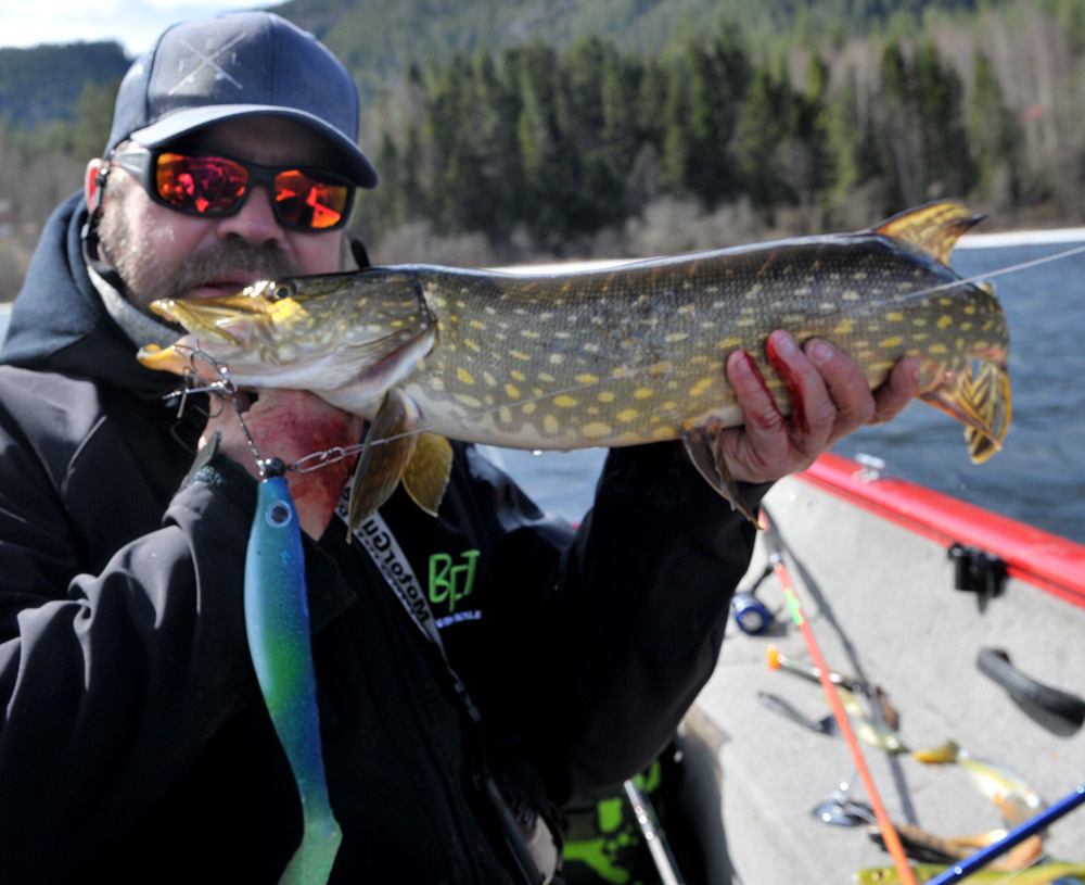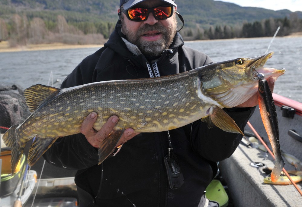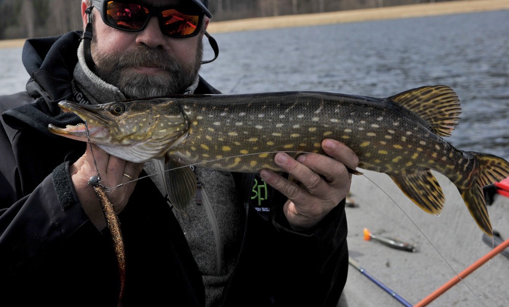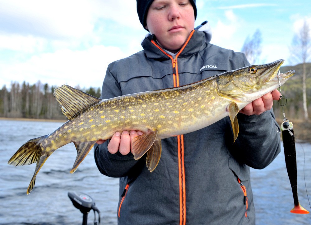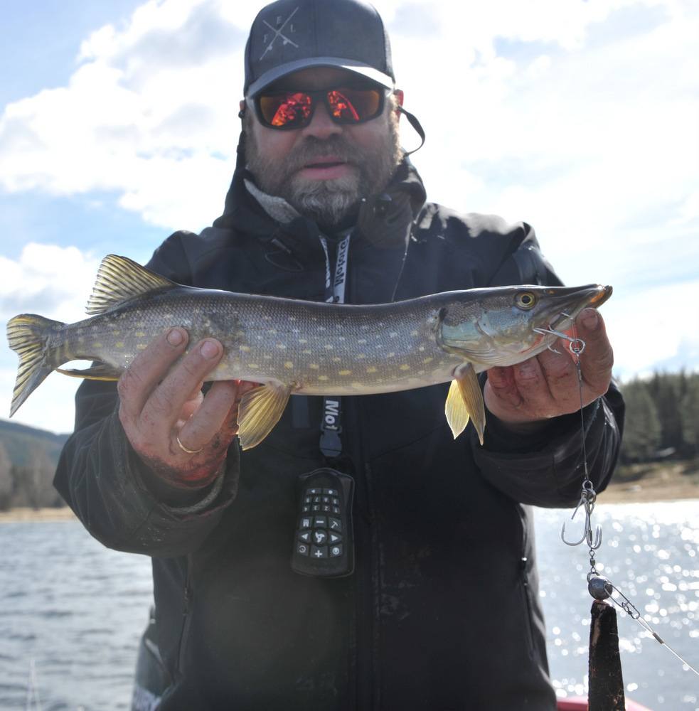 Men så er det jo dette med gjeddefiske da, at de hugger samtidig og holder kjeft samtidig. Så det er bare å stå å nøta i områder der du vet fisken er, til slutt så tar den. Men i dag så skulle vi fort merke at den var lite løs i høgge, den gikk liksom å små tjafsa på shadden. Ville liksom ikke helt ta. Så det ble en del bomhugg. Nå var vi så heldige at ikke alle oppførte seg slik, så vi skulle faktisk få litt fisk etterhvert.