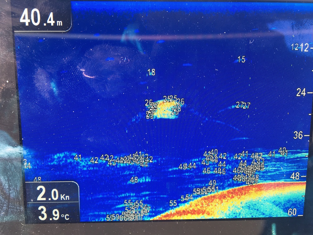 Ellers så var det mye fisk å se på ekkoloddet, innimellom i en sånn tetthet av krøkle at giveren ikke klarte å vise hvor dypt det var.