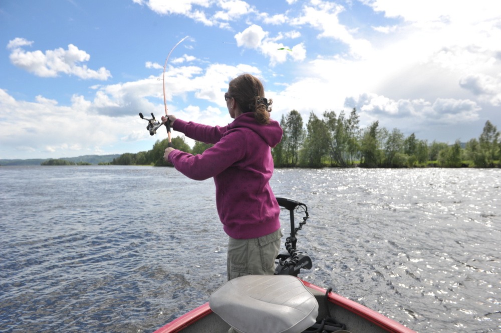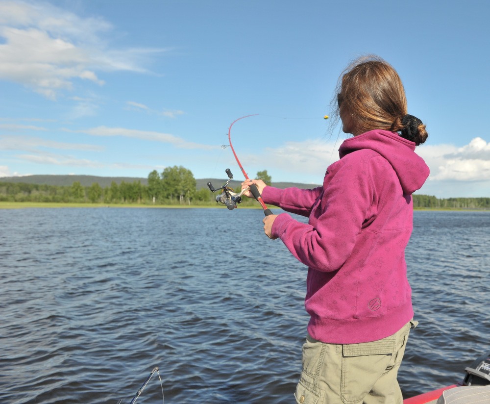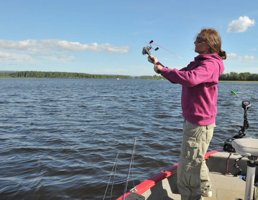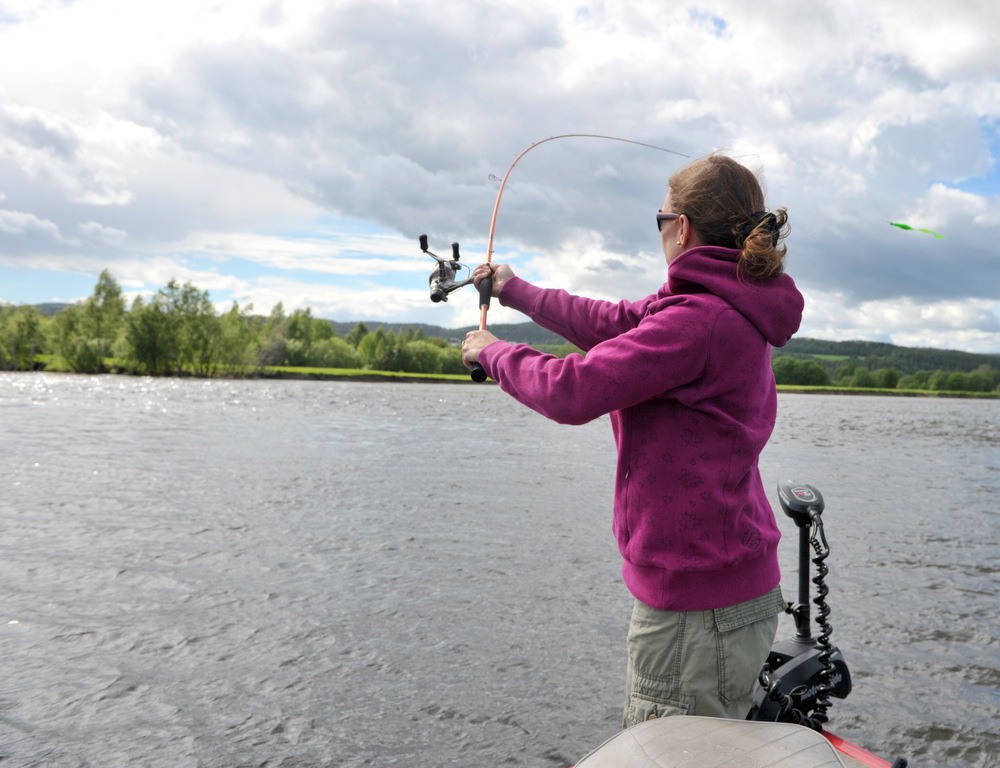 Fru Roos Aas som har bryllupsdag i dag (8. juni) har blitt en meget habil gjeddefisker. Og teknikken begynner å sitte. Hei fræsk dame som det er lett å komme i diskusjoner med. Dette turen ble mye viet til prisen på salat kylling kontra ferdig stekt hel kylling. En diskusjon som jeg vant på Knock out….. Ikke sant Rick ?