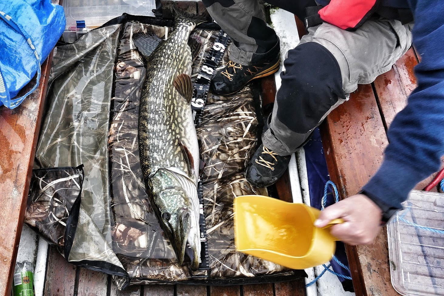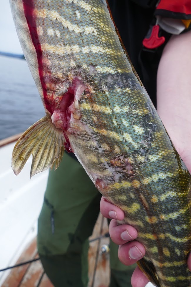 Gjør en liten forflytning til et område der det ligger en stor haug med synketømmer på bunnen. Her må det da om ikke annet stå noen mindre gjedder. Men også her er det stille som i graven, men fortsetter å gnu. Går mange kast før det skjer noe, men når tilslaget sitter så skjønner jeg med en gang at det er en bedre fisk. Går dypt og lina bare freser av snella. Jeg kjører fisken steinhardt så den ikke skal få mulighet til å gå i tømmeret. Virker etter hvert som om det går opp for den, nå vil den bare ut på dypere vann. Opp med ankerlina, greit å få den ut av veien. Det skal vise seg å være lurt da den hadde flere runder bak båten nede i dypet.