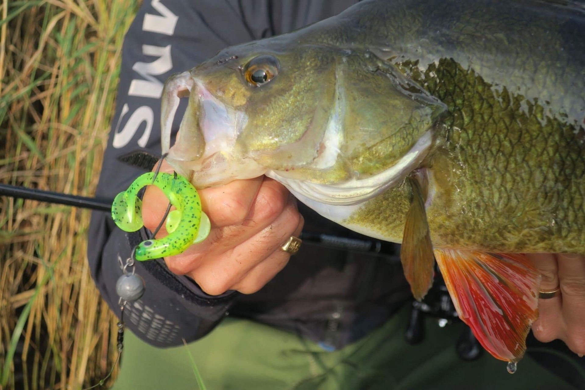 Efter ett par kast märkte vi att det var ganska mycket vegetation i vattnet och jag bytte till en 4/0 offset krok på ett 10g link head huvud och sätter på en 10cm Finn shad i färgen Lemon Chartreuse då det var ganska grumligt i vatten.