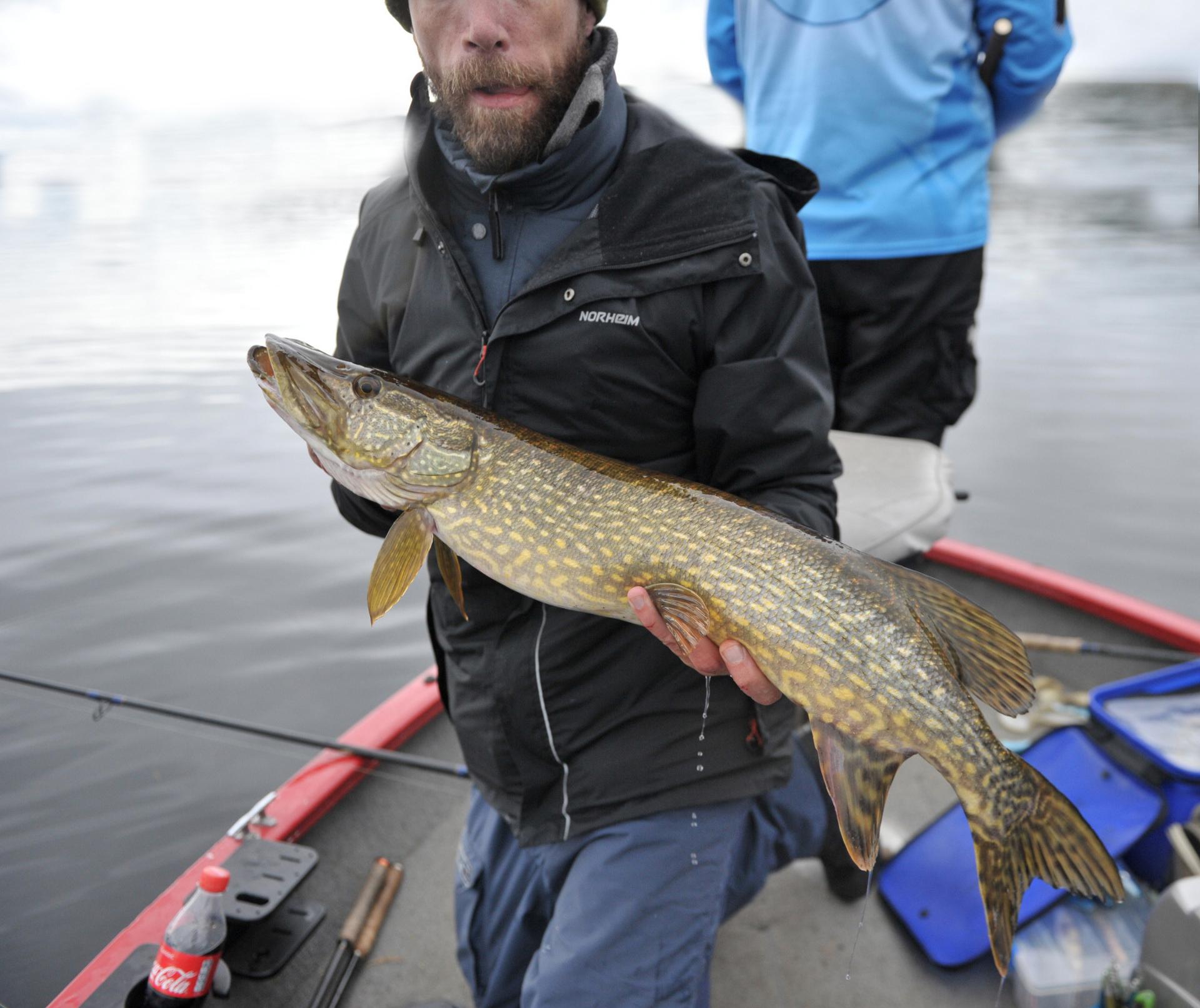 Så skjer det som setter en ekstra spiss på fangsten. Michael tester en av syne nye cranks og vips så har han tatt enda en grei pike. Vekt er uvesentlig når slike ting skjer. Det er rett og slett morro uansett.