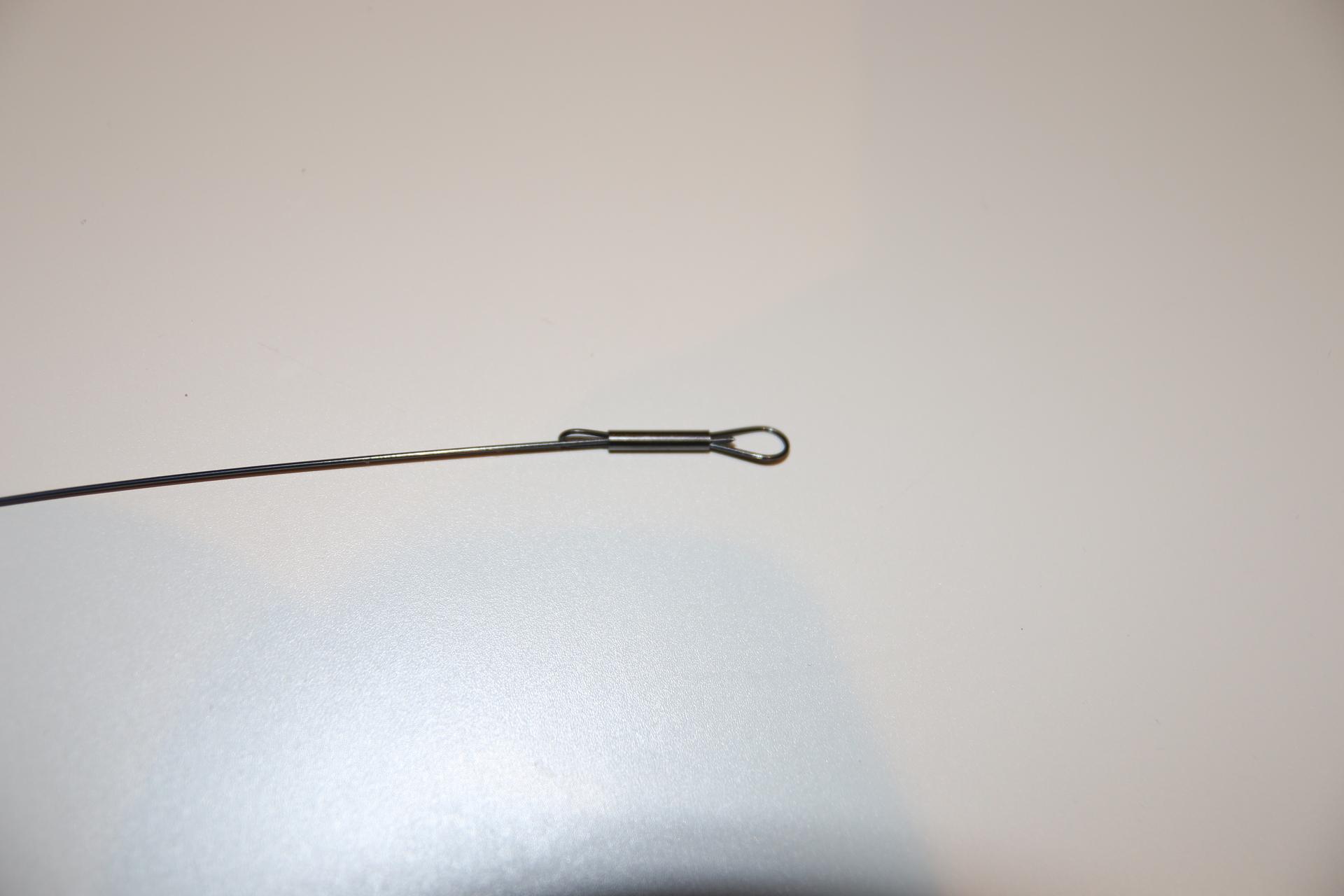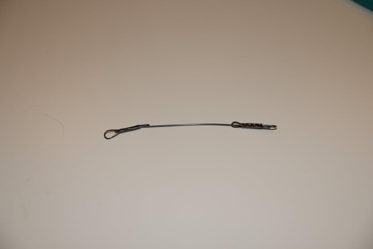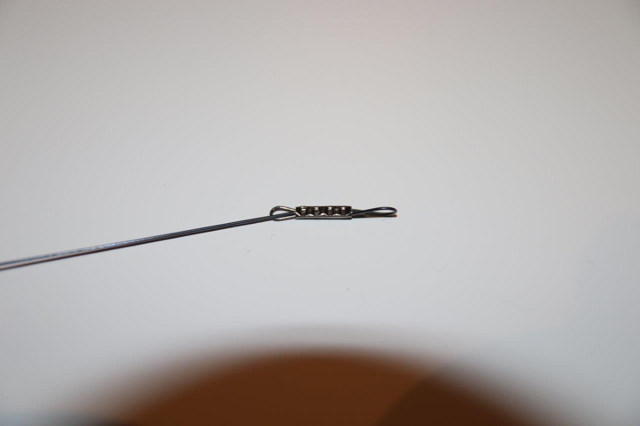Jeg trer wierern tre ganger gjennom crimpen før jeg crimper, her kan de små tengene være til hjelp. Pass på og ikke knekke wieren her, da må du gjøre det på nytt. Da skal det se ut noe som det her: