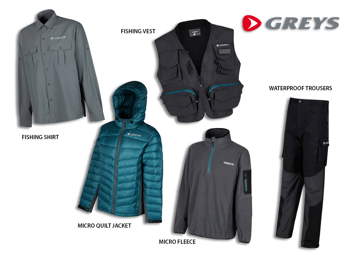 I Greys klädkollektion finns bland annat en Micro Quilt Jacket i Thinsulatematerial, Fishing Vest med ett flertal fickor och förvaringsmöjligheter samt hållare för tafsspolar och foam-patch för flugor.
