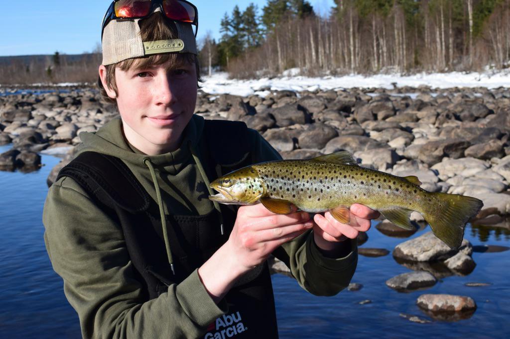En liten ørretrapport fra 12.04.2018. jeg bestemte meg for å ta en kort tur til Glomma dagen etter 2+ ørreten. Ble så klart gira etter ørretopplevelsen. Klokken nærmet seg 16.00. Kanskje litt seint å gå ut, men skolen må (dessverre) prioriteres først. Det var strålende vær, og sola skinte. Etter litt tenking, kom jeg frem til at jeg vil ha fargen sølv på sluken min. sola skinner ned i vannet som da gjør at sluken lyser og blinker. Kan dette få fisken til å bite? Jeg går frem til plassen der jeg har tenkt til å fiske og kaster ut, plutselig kjenner jeg et lite napp i stanga, Denne fisken var veldig forsiktig. Men etter en liten fight fikk jeg den på land. Virker som at fisken biter når jeg sveiver sakte, de er nok litt rustne fra den kalde vinteren.