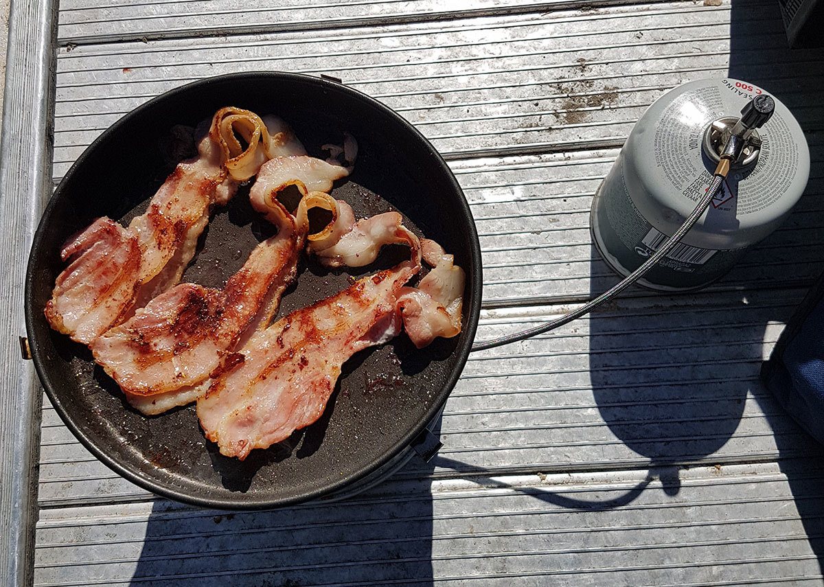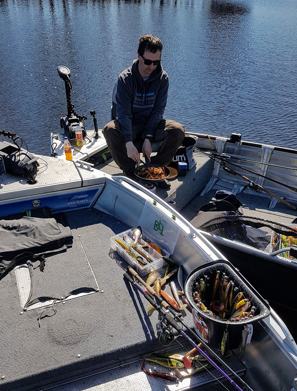 Etter dette, fisker vi over området litt, men uten noe respons velger vi forholdsvis raskt å ta lunsj. Det gjør seg godt med litt mat ute på slike lange dager. En pannerett, pølser eller hamburgere er lettvint å lage til ute på primusen eller stormkjøkkenet. Stemninga er på topp, praten går lett og det smakte virkelig med litt god mat.
