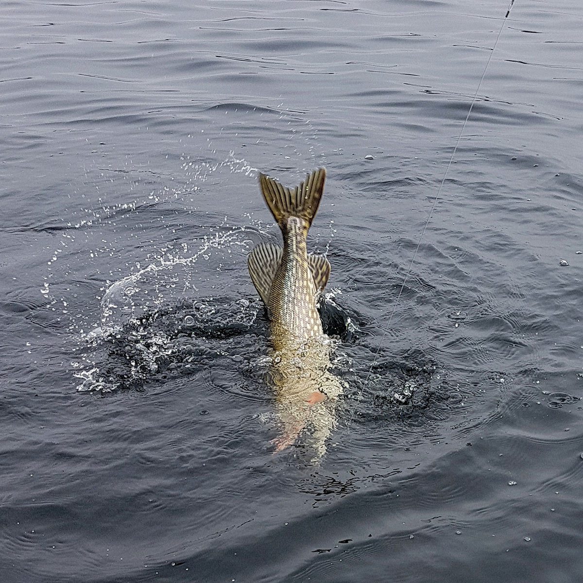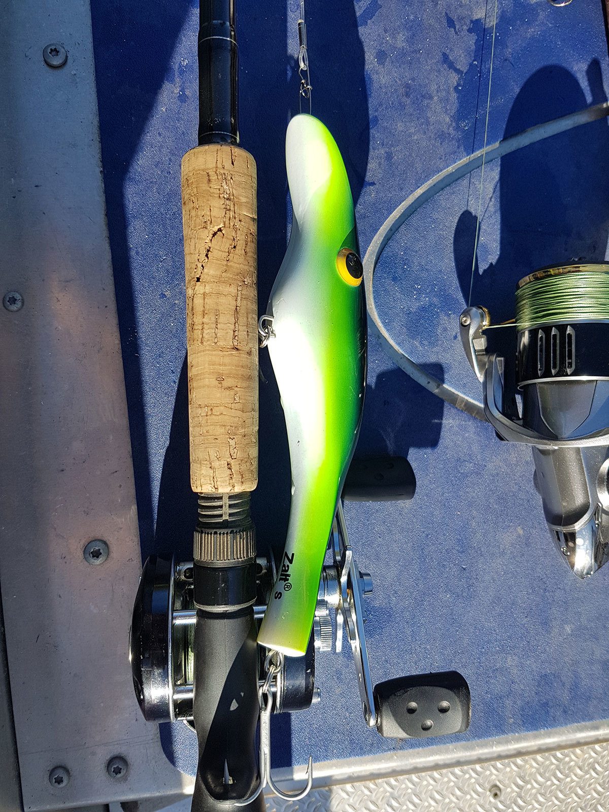 Det går en stund uten at det skjer stort annet enn et par ørsmå hugg. Så forsiktige, bare smålugg i baitsene. Thomas opplever det samme og har misset et par fisker. Jeg setter meg ned for å hvile ryggen litt og slenger uti en platypus på ei stang og en zalt wobbler på en annen. Prøver meg på litt sakte «bondetrolling» for å lete fisk. (Med bondetrolling, mener jeg bare enkel dorging med et par stenger uten stort av utstyr for trolling eller skikkelige stangholdere)