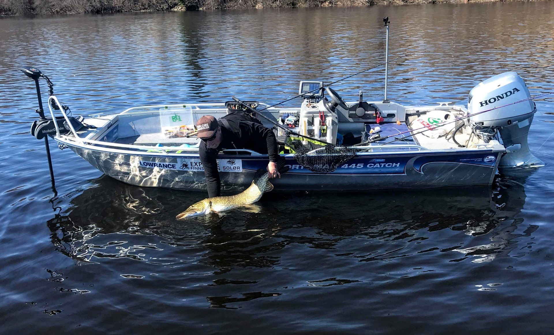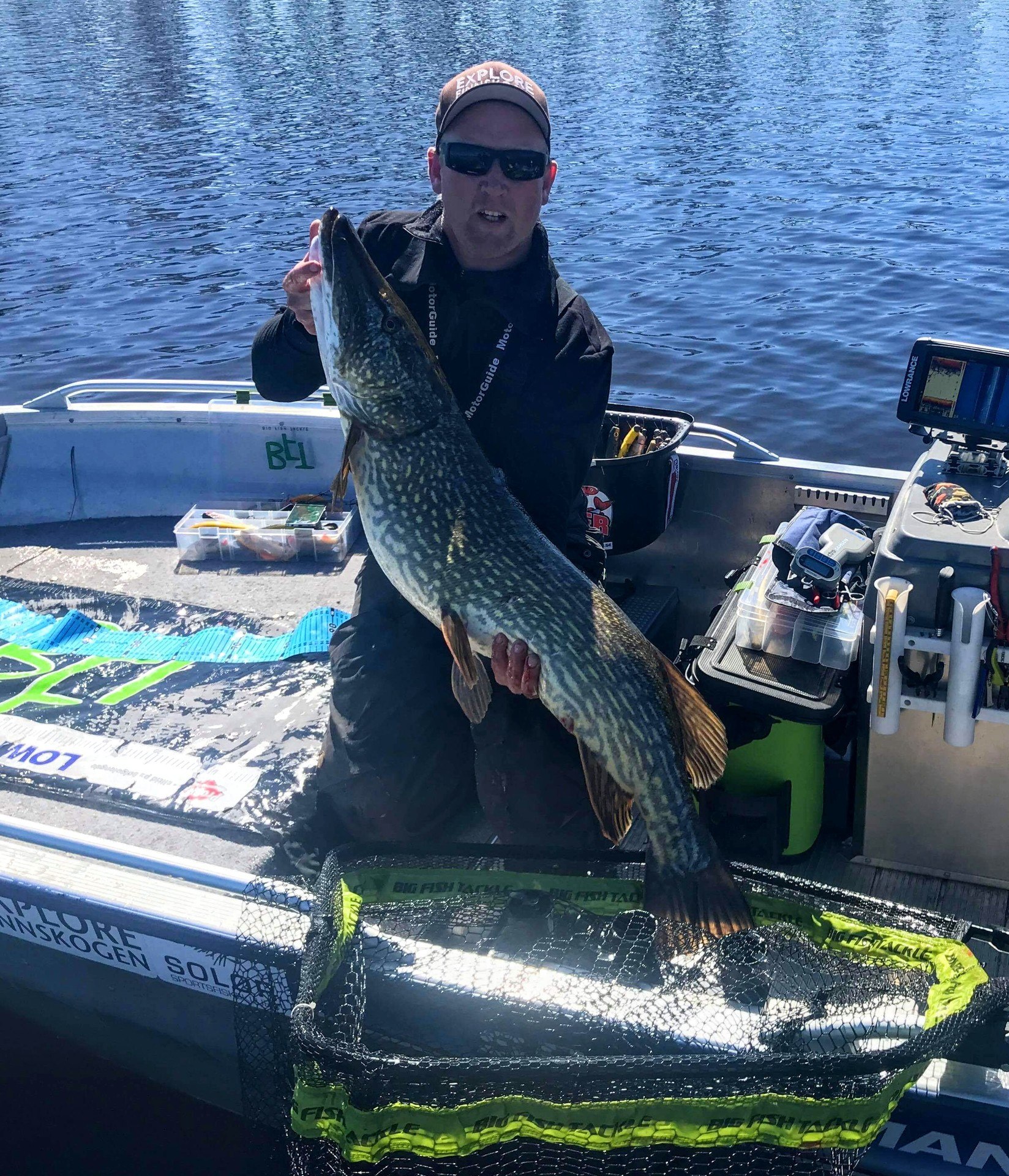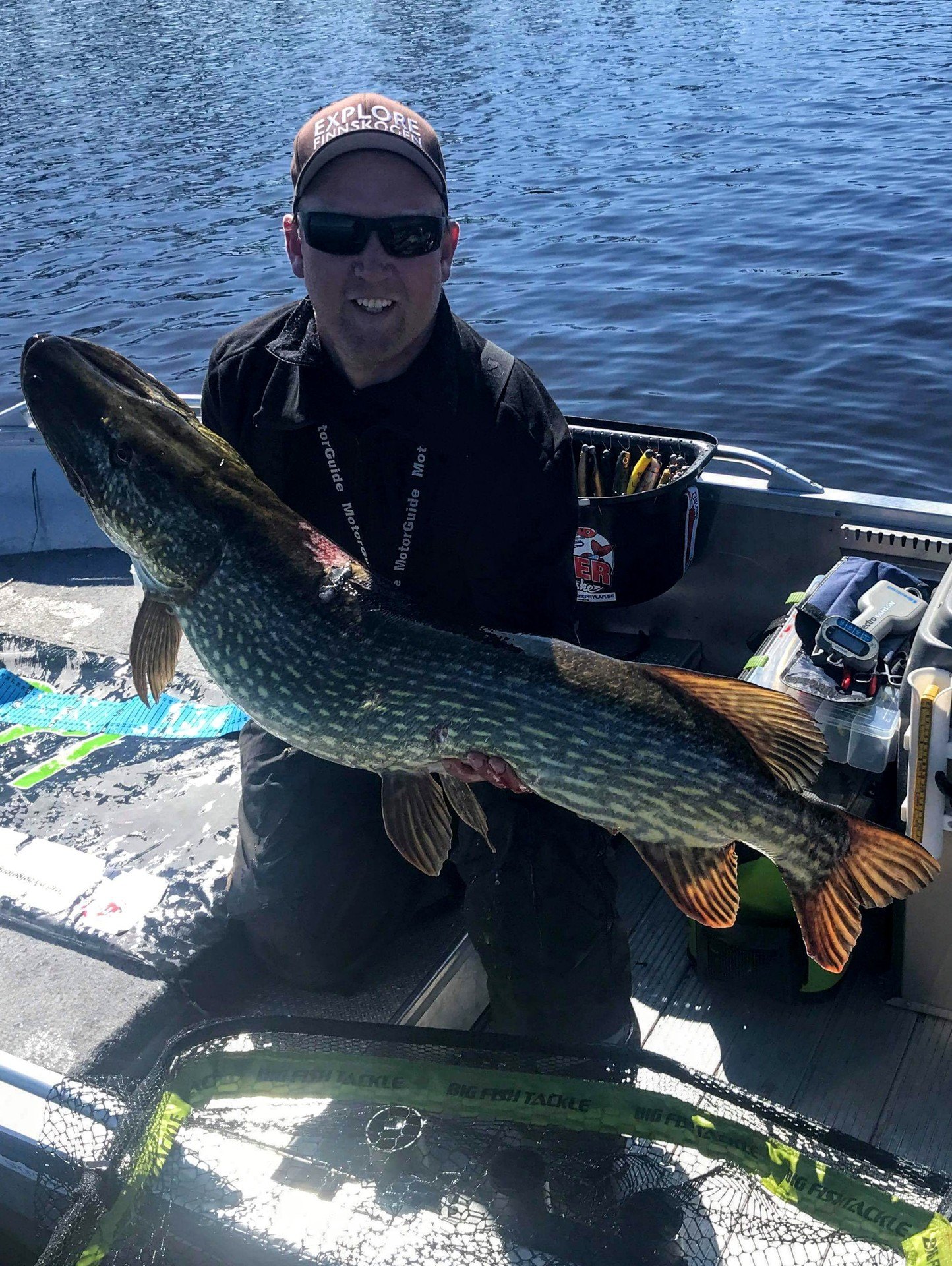 Litt forbi der den forrige fisken tok, gjør stanga med zalt-wobbleren skikkelig bue på seg. Jeg griper tak i stanga og løfter opp. Kjenner tvert at dette er noe av større kaliber. Det gynger tungt nede i dypet noen ganger før fisken går rett opp. Gjedda bryter overflaten og jeg ser at det er ei stor gjedde. Skjelven kommer tvert! Her har man verken gjort klart kamera, håv, avkrokingsmatte eller noe, og jeg griper fort etter den sammenpakkede håven. Å kjøre på stor fisk samtidig som å skulle pakke ut håv og annet utstyr kan virkelig være utfordrende. Får akkurat pakket ut håven i det gjedda bryter overflaten igjen. Dæven, hu er stor! -Må få tak i Thomas! Dette må dokumenteres. Får rotet frem telefonen og satt på ringing mens jeg prøver å kjøre fisken hardt mot håven som henger utafor ripa. Gjedda kommer greit inn mot båten og er raskt klar til håving. Først når jeg ser fisken gli inn i håven, ser jeg hvor stor hun faktisk er! -Et skikkelig gledesbrøl kommer raskt! -Kan det være snakk om ny pers?