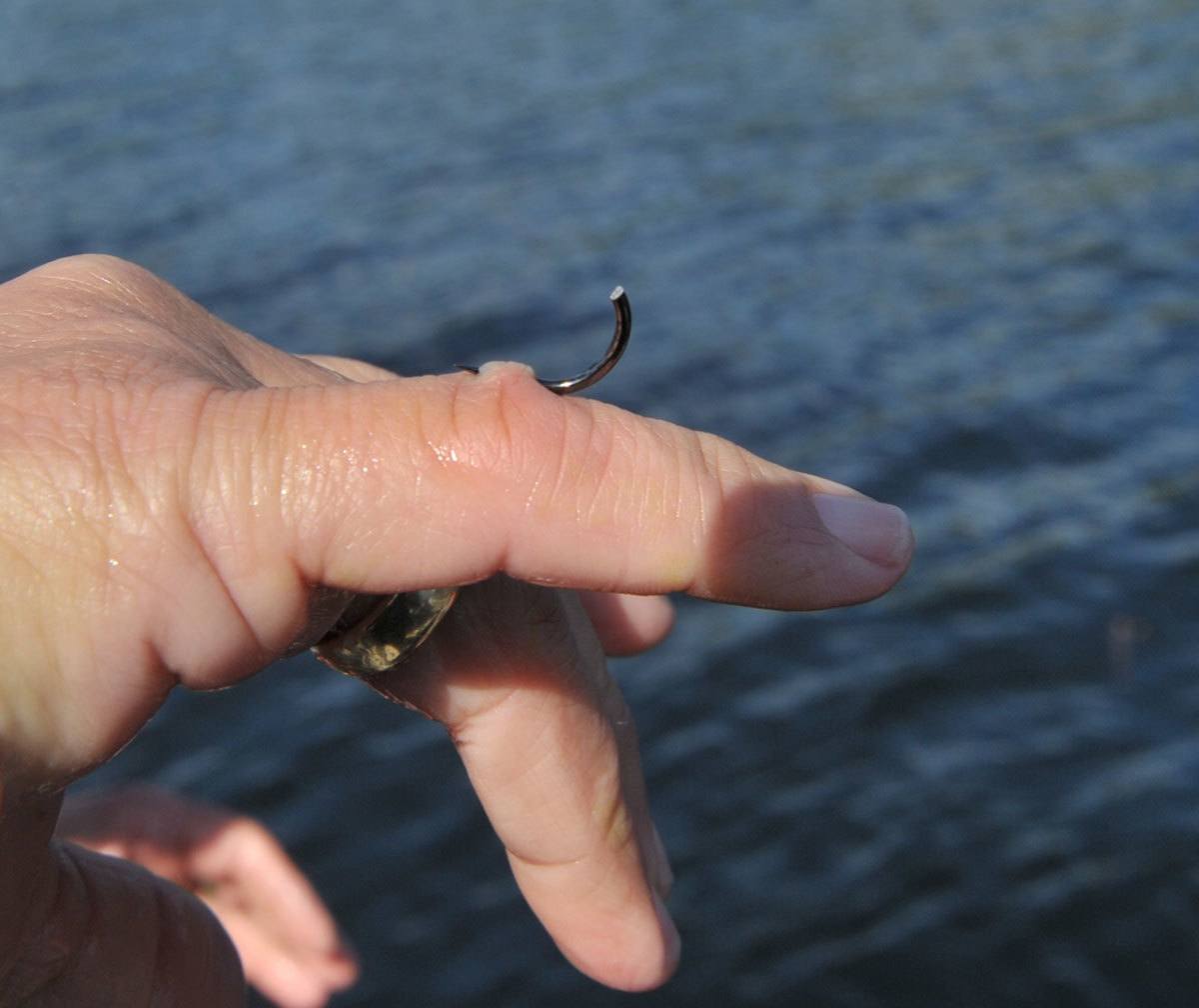 Hun var riktig så heldig. Da den satt veldig fint og med spissen ut. Hun prøvde selv å dra den tilbake den vegen den kom inn, men det er litt bortkastet da mothaken gjør det umulig. Så vi tok ei tang og fikk dratt kroken videre ut og vipps var Fruen løs. Litt varmt/vondt gjorde det vist.