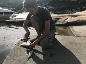 Alle makrellene ble tatt livet av, fordi de skulle vi ha til middag dagen etter. Etter at vi hadde kommet til land igjen, var det bare å begynne og sløye fisk.