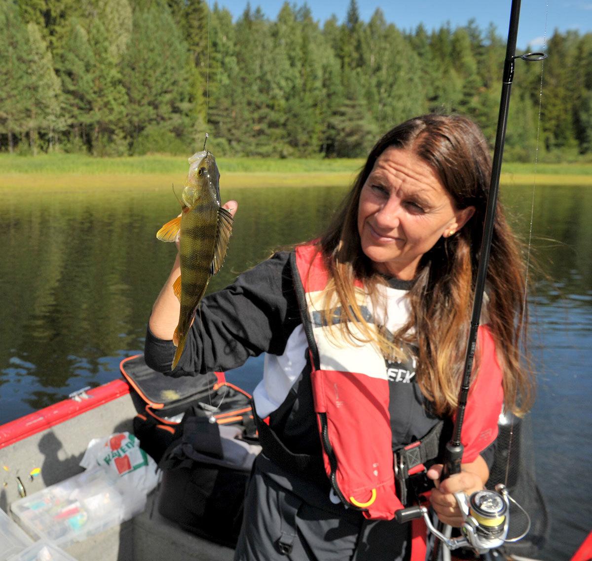 Men så satte Kristin Roos Aas litt fart. Hun hadde nå fått lånt en 13fishing stang og kjørte med Drophot. Og vipps kom det opp to flotte gullabborer. Utrolig gøy syntes Kristin.