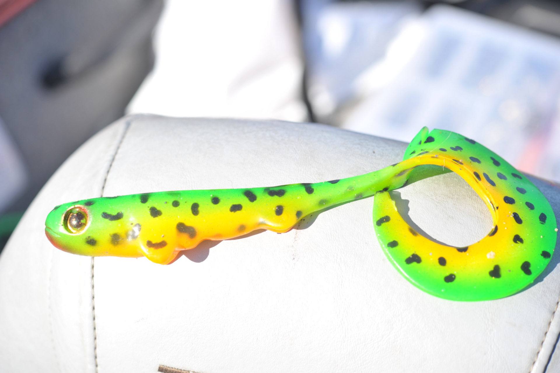 Kristin skulle få den første fisken i båten. Nå hadde vi flyttet oss over til øst og etter å ha testet ut et par plasser uten resultat, fikk hun fisk på den tredje plassen. Det var en wolfcreek shad i den nye fargen regnbue som leverte varene. Stemmingen ble straks litt bedre. Gøy at Kristin leverte.