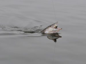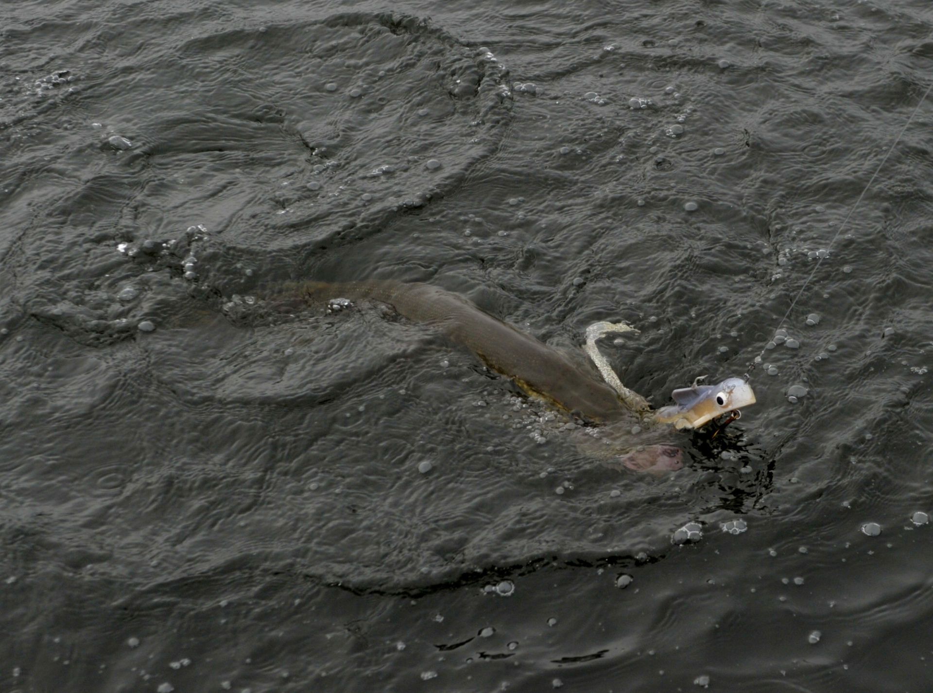 Så smeller det heftig på  Beastlytailen til Kristin i vår egen farge. Vi forsto kjapt at dette var en større gjedde. Noe som også finnes i dette område. Når vi fisker med tail nå, så fisker vi så lett,så lett selv når vi skal ned på 8-9-10 meters dyp. Noen ganger må vi telle opp til 20-25 sekunder før den er på bunnen. De sekundene kan være svært verdifulle.