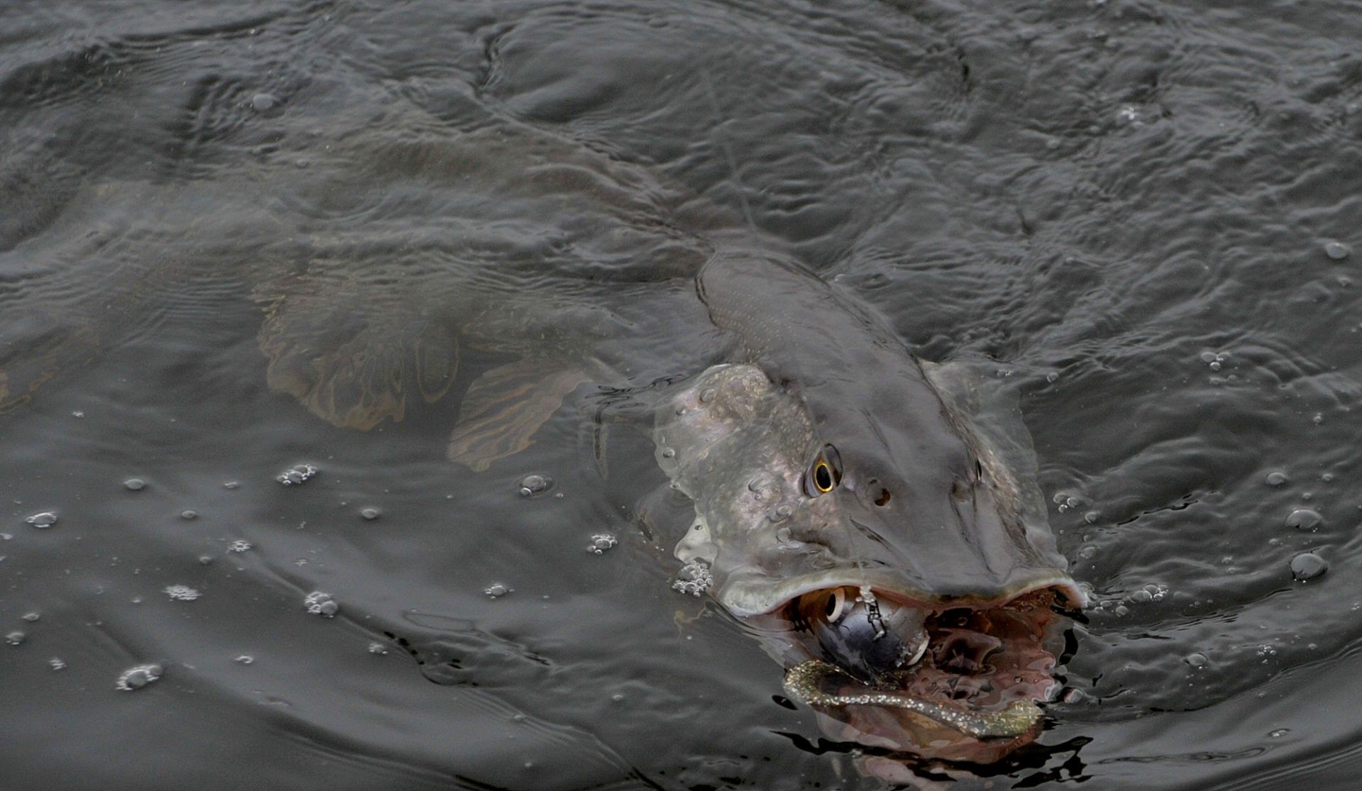 Så mens jeg er i ferd med å løfte den så smeller det til. Og jeg kjenner med en gang at dette er svær fisk.  Det blir en real fight. Hu var j****** tung. Men jeg må si med Defy Swimbait stanga og 13fishing A3 snella så føltes det som om jeg hadde grei kontroll. Så god kontroll man kan ha når fisken er såpas stor.
