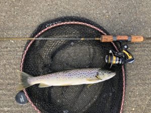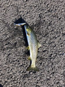 Siste dagen da vi skulle hjem ble det bare en men den var 39,5 cm og veldig tynn! 465 g. Men den tok på den samme tricorollen som jeg fikk de andre sjøørretene på. Stanga jeg brukte var en osmose lure 1,5-7 gram og 190cm lang med en liten 1000 snelle fra shimano. Allt i allt 6 sjøørret.