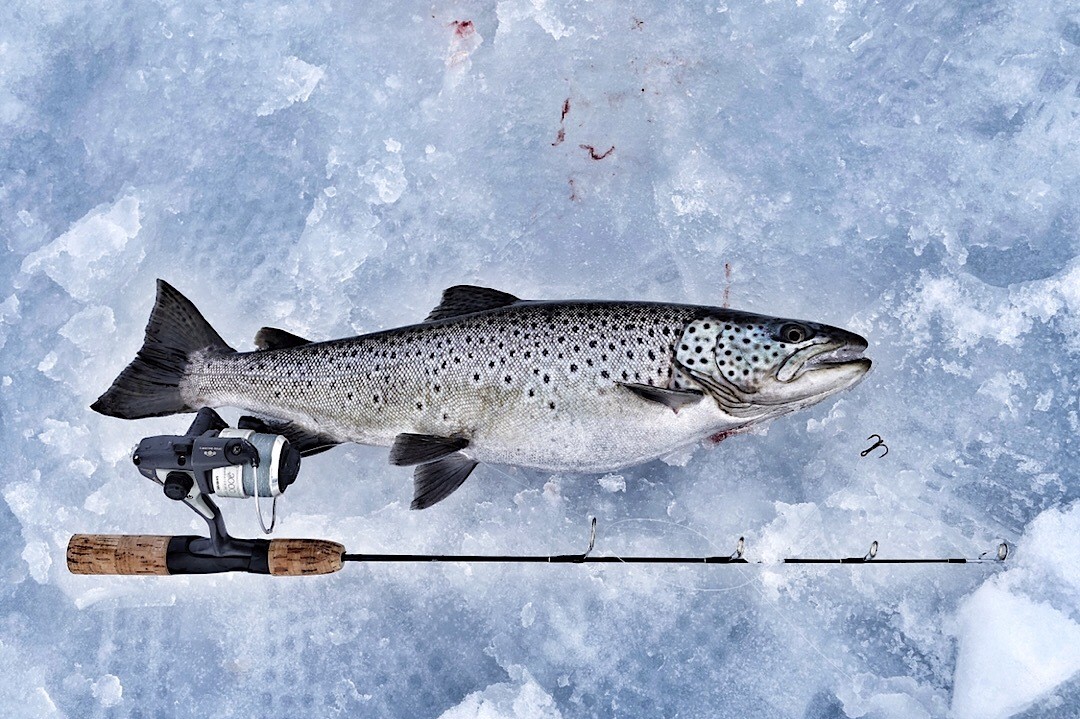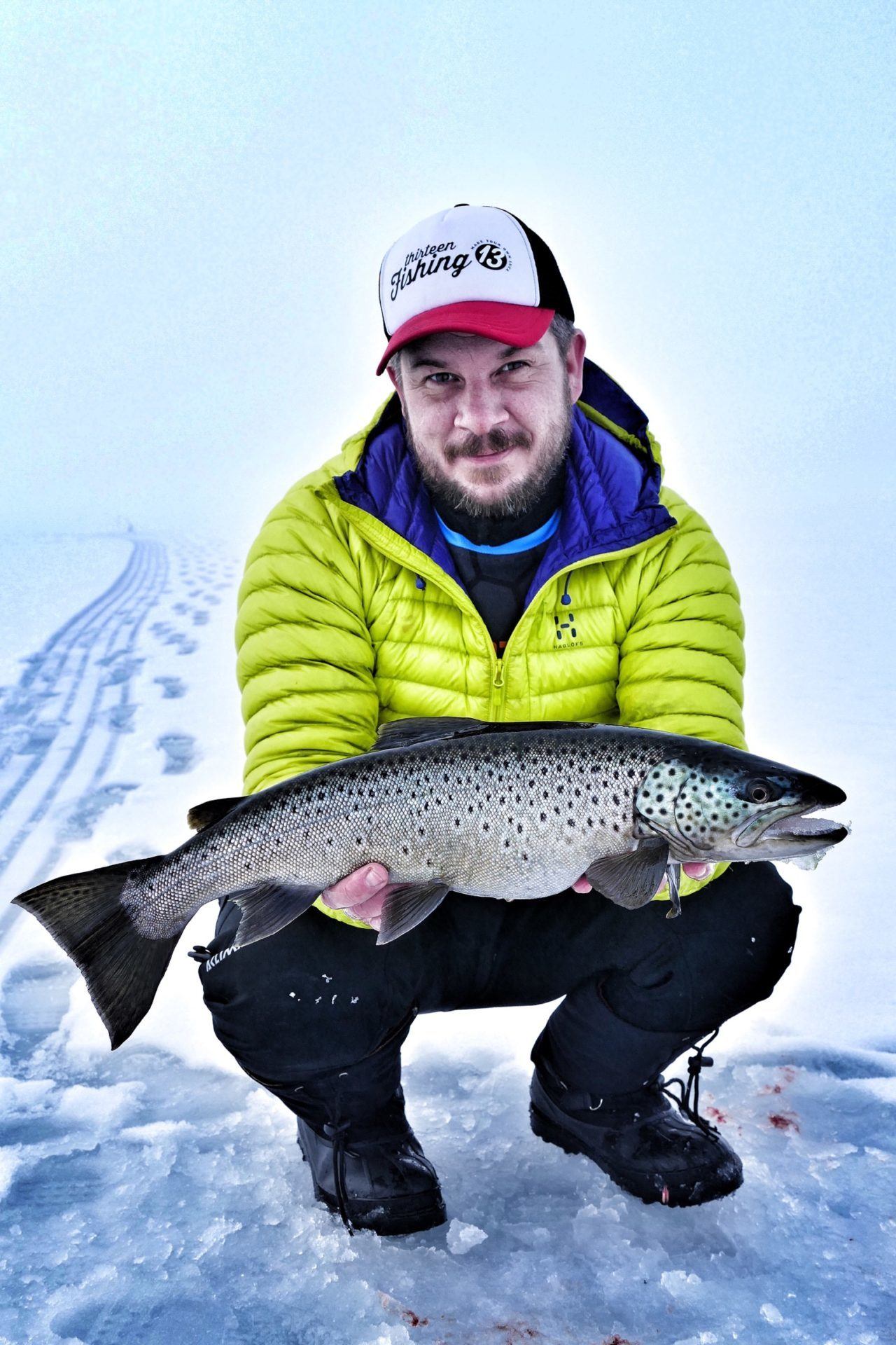 Da gikk det ikke lang tid før den første ørreten kom opp på isen. En noe farget fisk, men uansett en flott ørret.