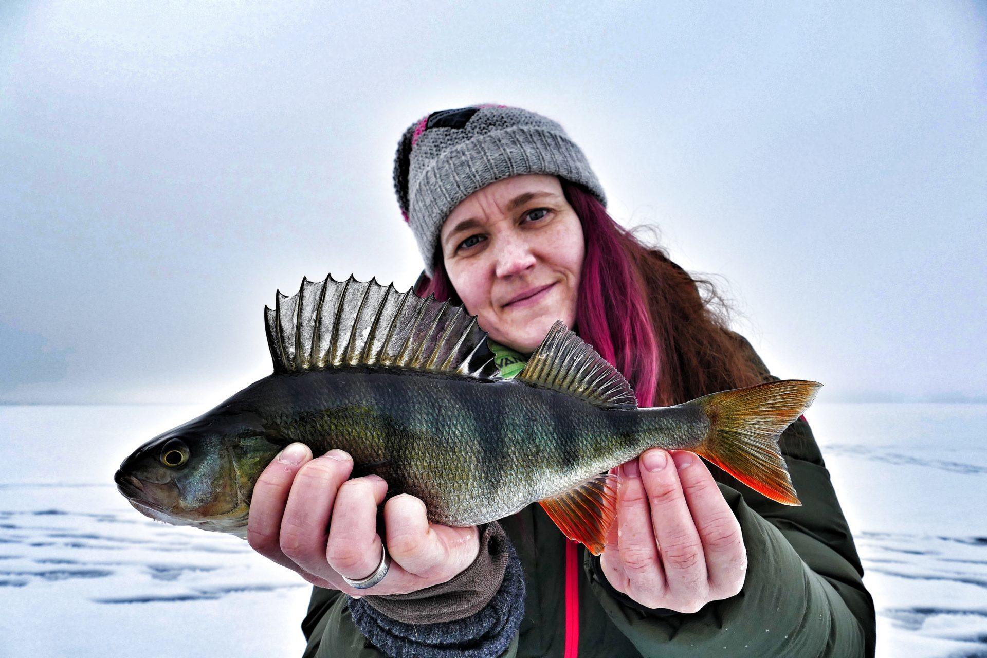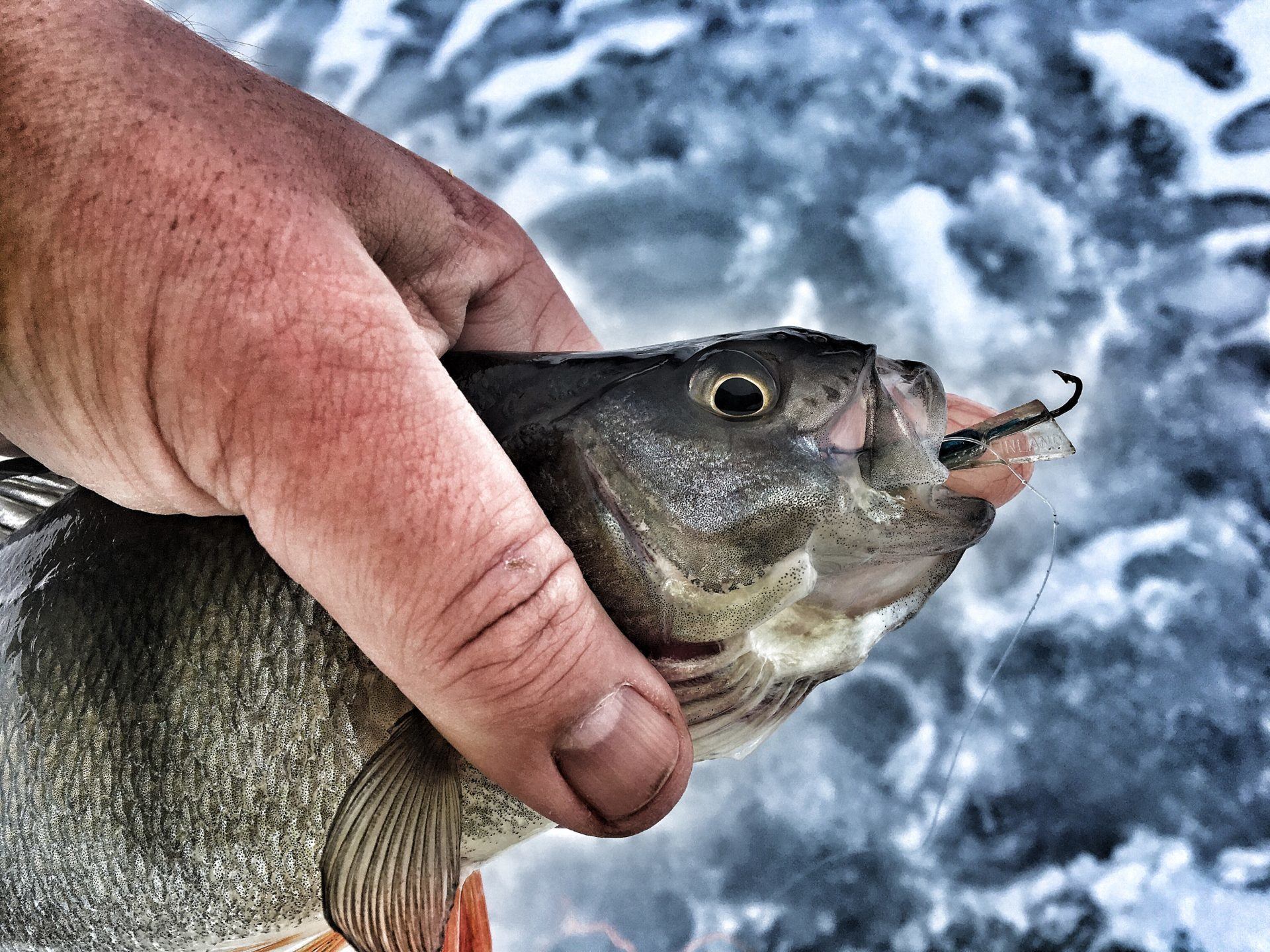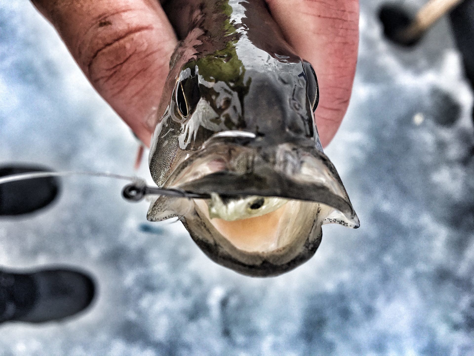Fire stenger med krøkle ble satt ut på dybder mellom en og 15 meter under isen, før vi rigget oss til på kanten med balanse og dropshot med ekkolodd så kunne vi greit følge med på både byttefisk og større fisk.