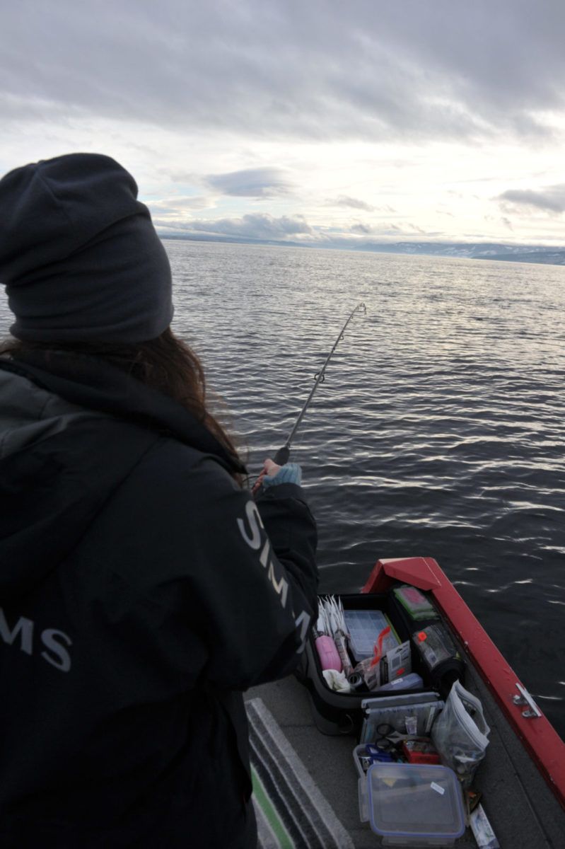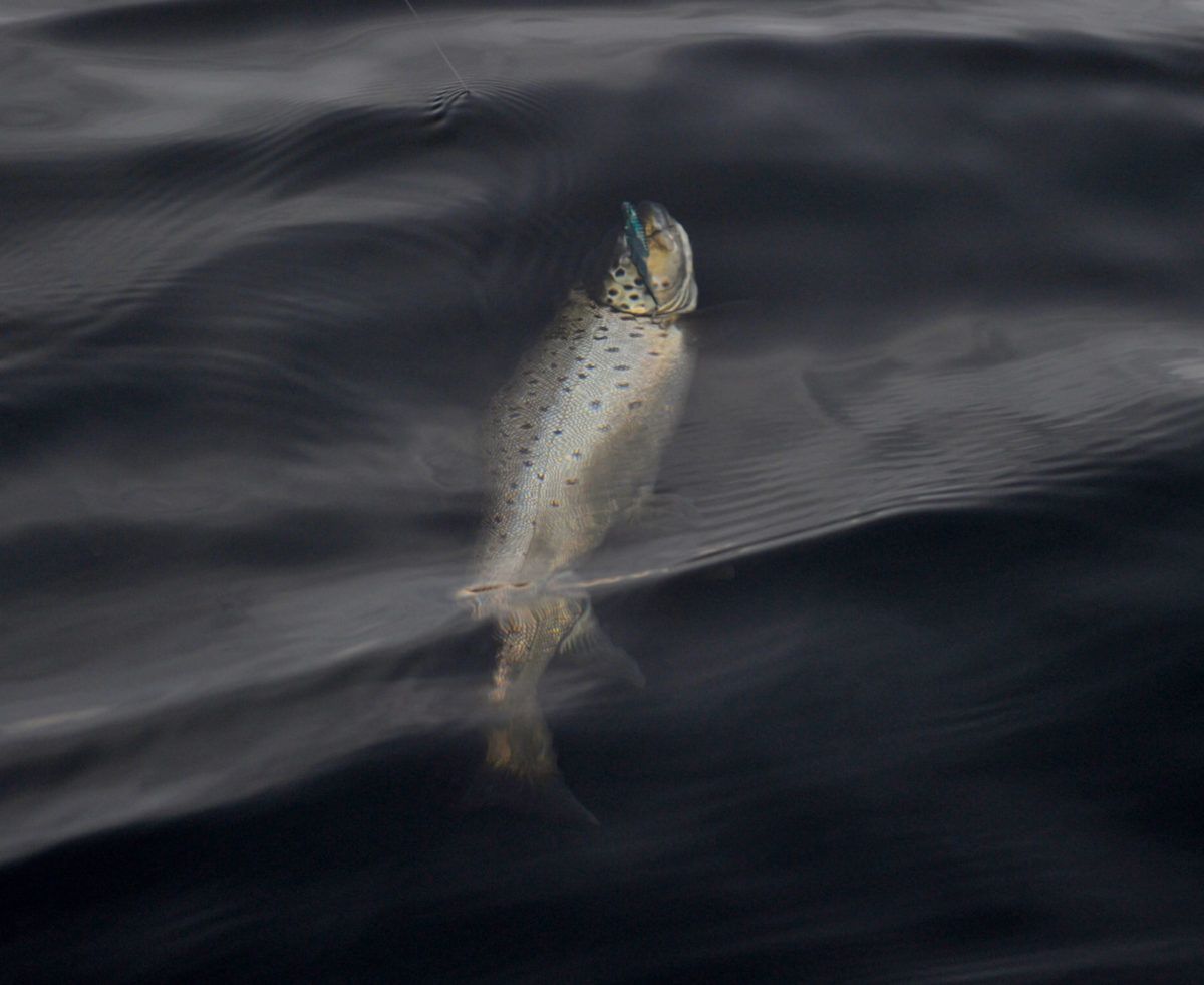 Jeg har aldri vært med om et ørretfiske som vi har opplevd på de to siste turen på Mjøsa. I dag på det aller første ørretkaste til Kristin så smalt det. Det er helt vilt. Nå er det ikke så lenge siden vi fikk bra, men fisken var relativt smale og «daue» Nå var det noe annet. Enten spiser de seg veldig raskt opp, ellers så fant vi helt annen fisk på denne turen. Fisken til Kristin var stinn, rett og slett.