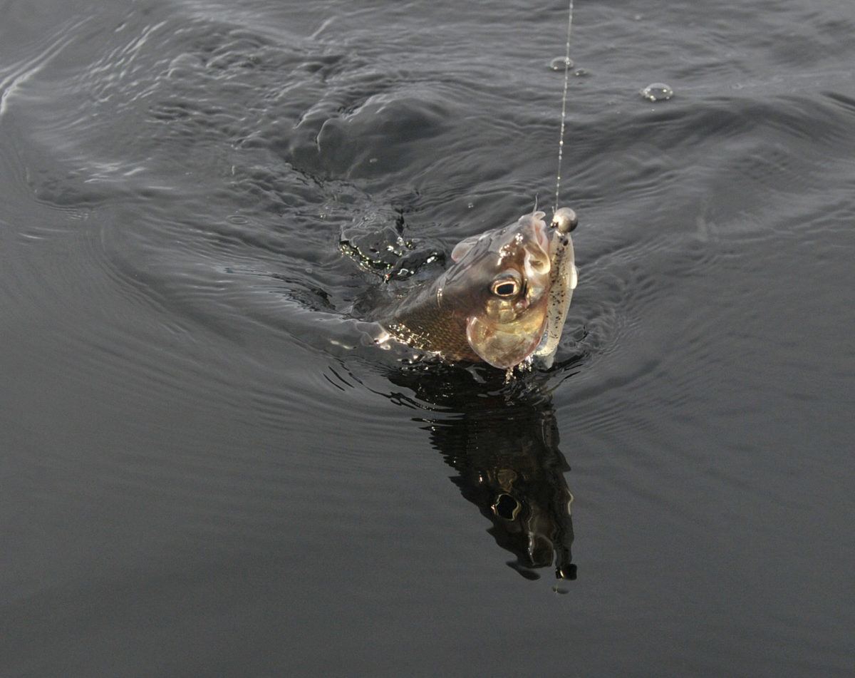 I mellom abbor og ørretene, fikk Thomas en helt ny art for oss under spinnfiske på denne båten. En riktig fin sik hadde tatt en Finn Shad. Da mangler vi egentlig bare gjedda.